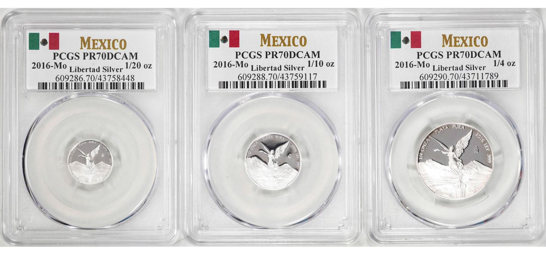 One Lot of 2016-Mo Mexico Proof 1/20, 1/10 and 1/4 oz Silver Libertad Coins PCGS PR69DCAM. PCGS Graded.
