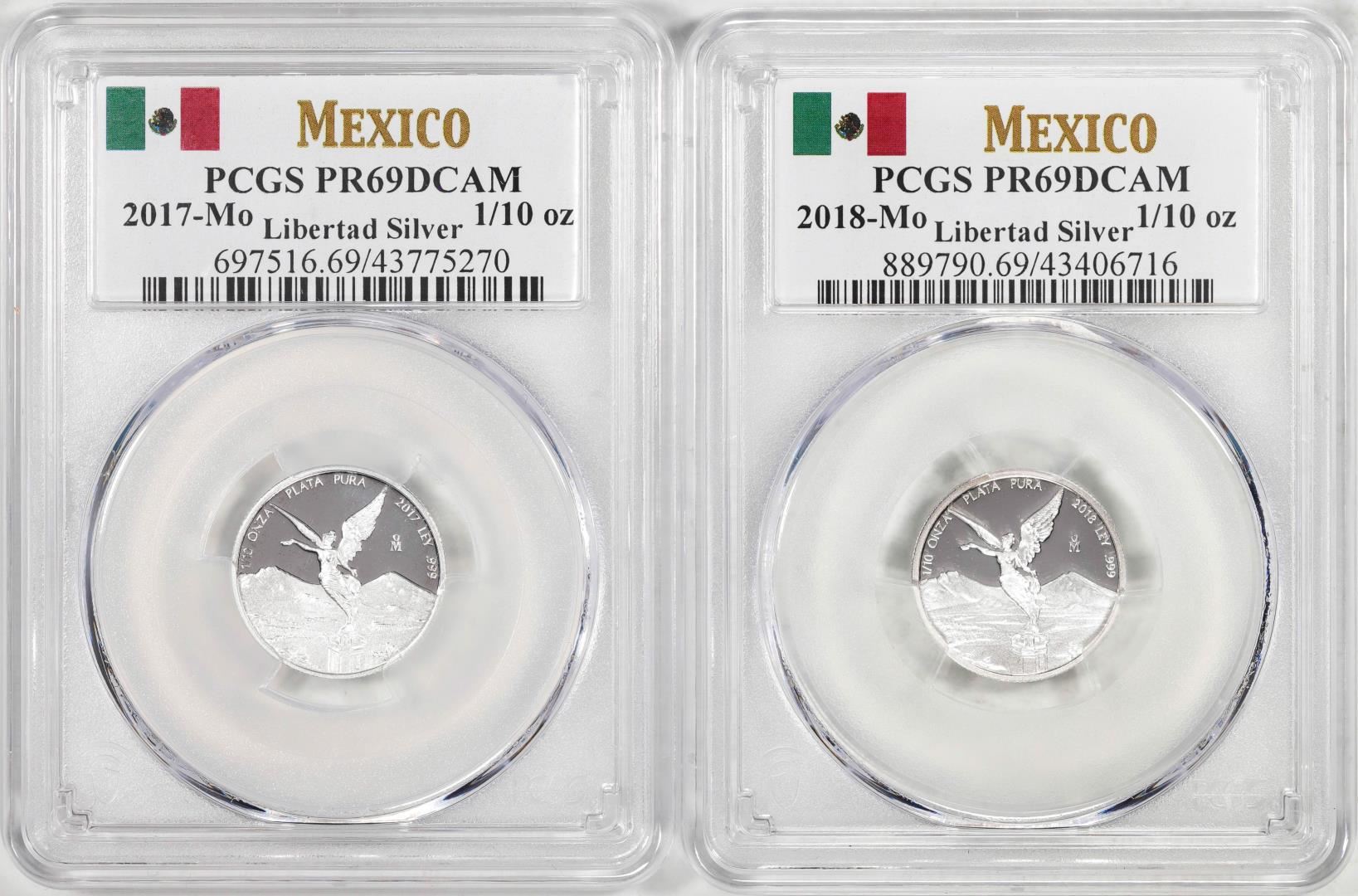 One Lot of 2017-2018-Mo Mexico Proof 1/10 oz Silver Libertad Coins PCGS PR69DCAM. PCGS Graded.