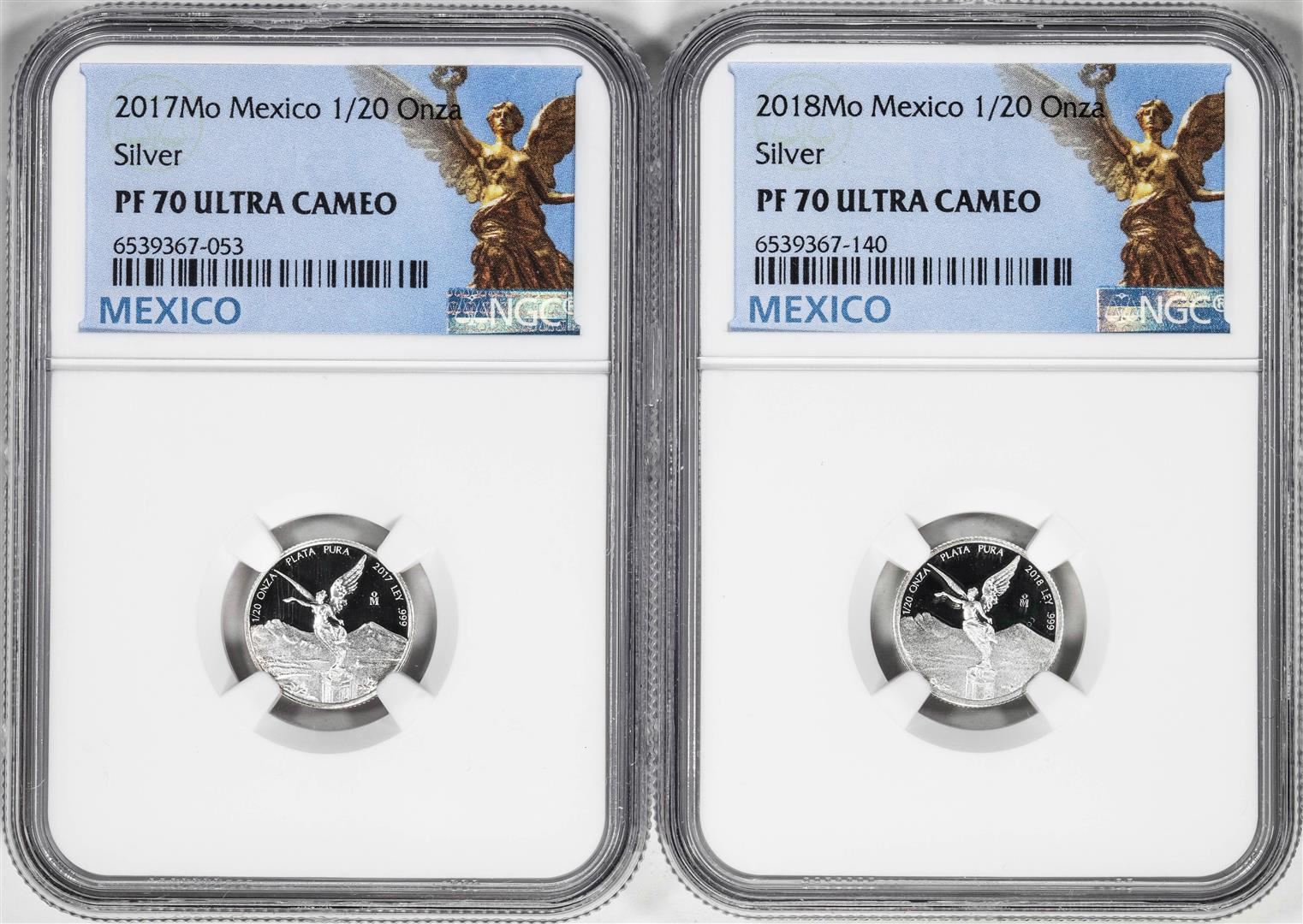One Lot of 2017-2018-Mo Mexico Proof 1/20 oz Silver Libertad Coins NGC PF70 Ultra Cameo. NGC Certified.