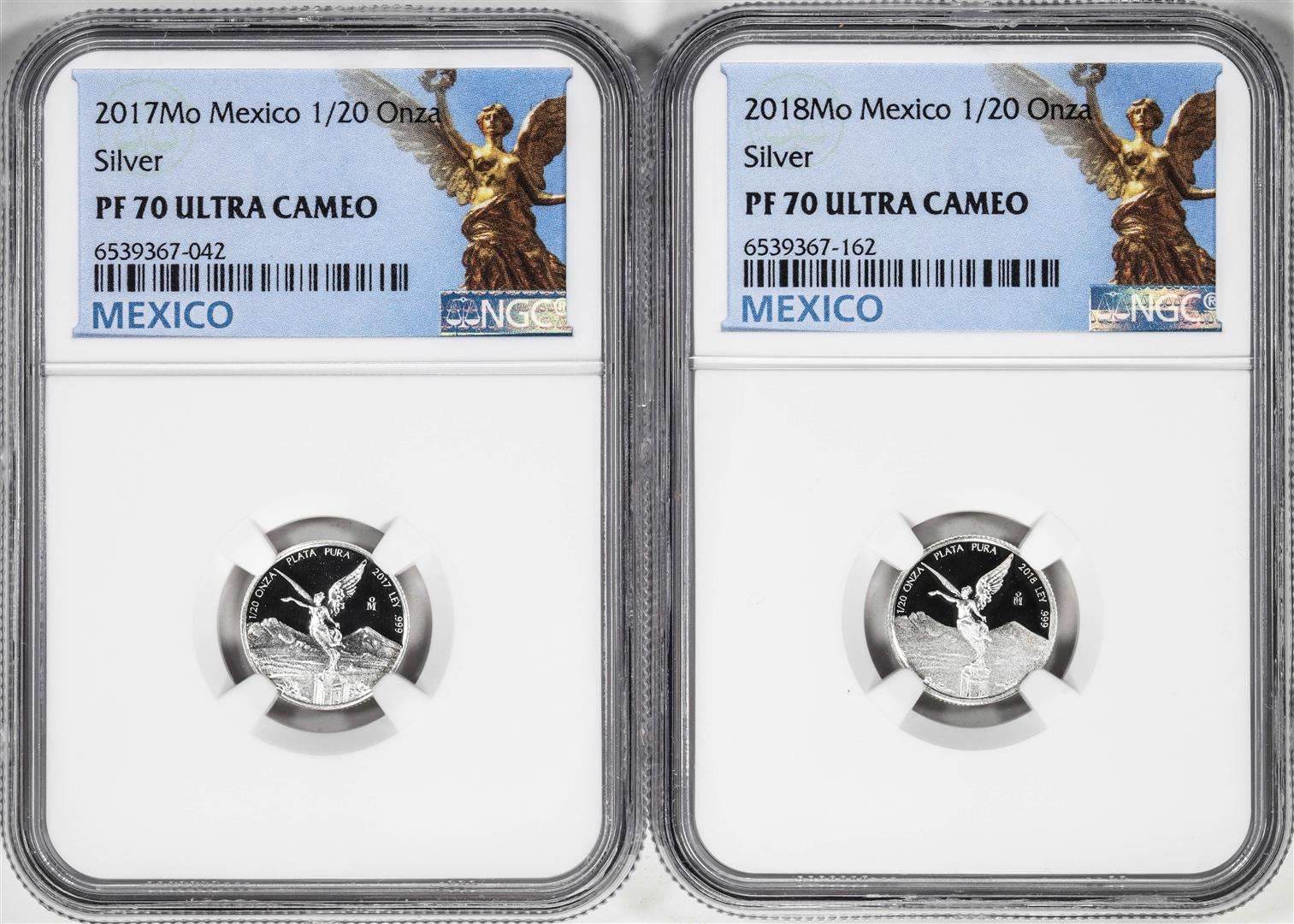 One Lot of 2017-2018-Mo Mexico Proof 1/20 oz Silver Libertad Coins NGC PF70 Ultra Cameo. NGC Certified.