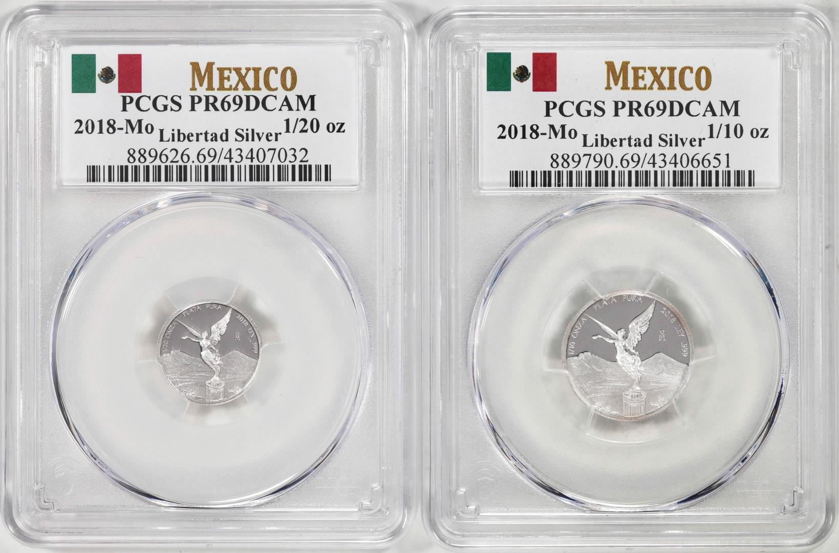 Lot of 2018-Mo Mexico Proof 1/20 and 1/10 oz Silver Libertad Coins PCGS PR69DCAM