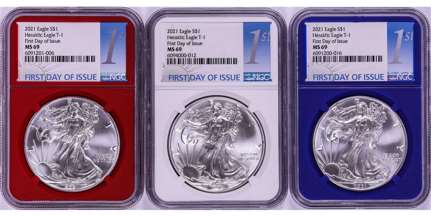 One Lot of 2021 Type 1 $1 American Silver Eagle Coins NGC MS69 FDOI Red/White/Blue Core.