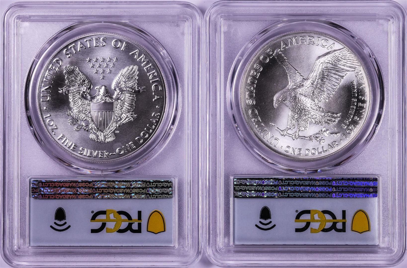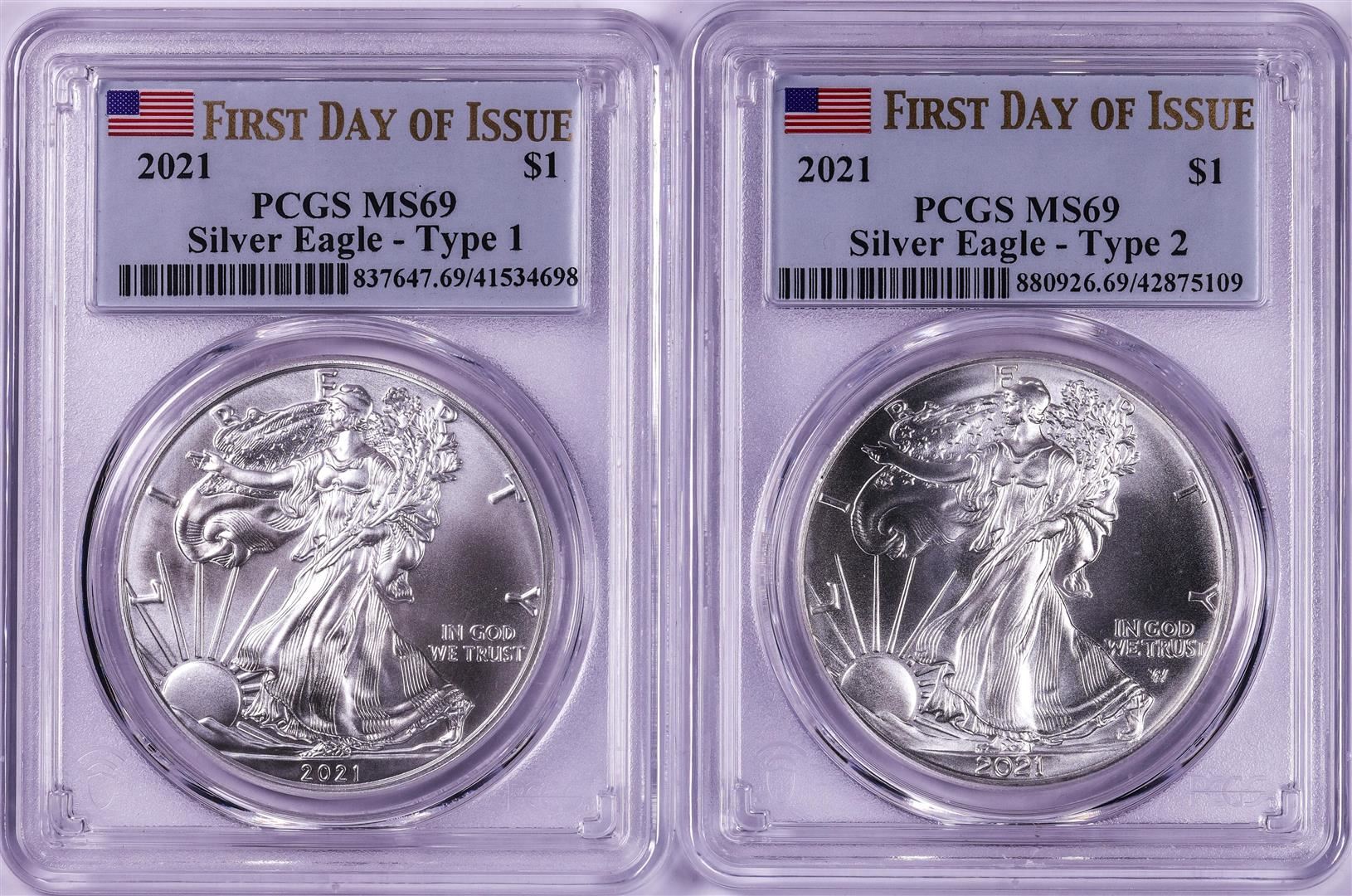 One Lot of 2021 Type 1 & 2 $1 American Silver Eagle Coins PCGS MS69 First Day of Issue.