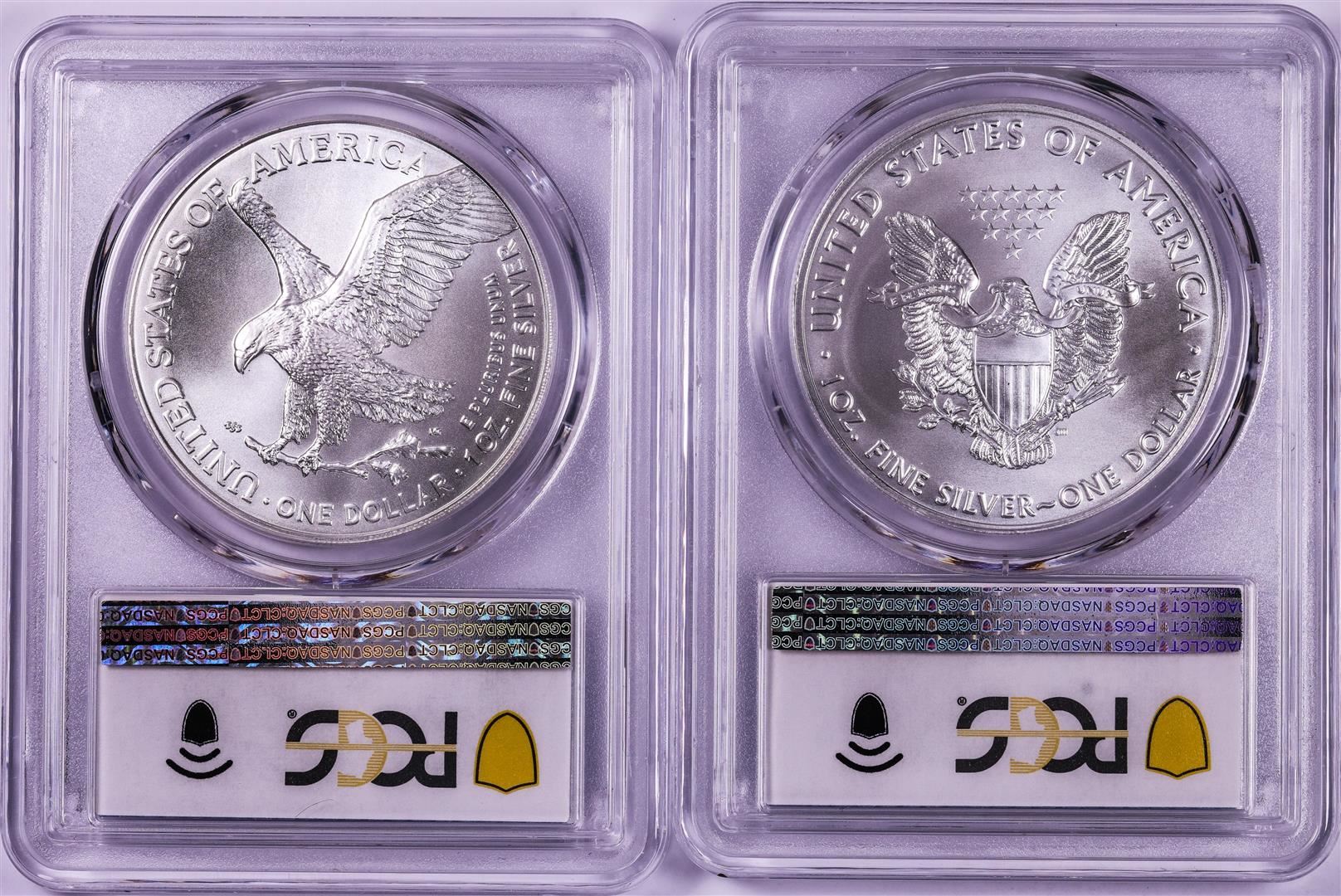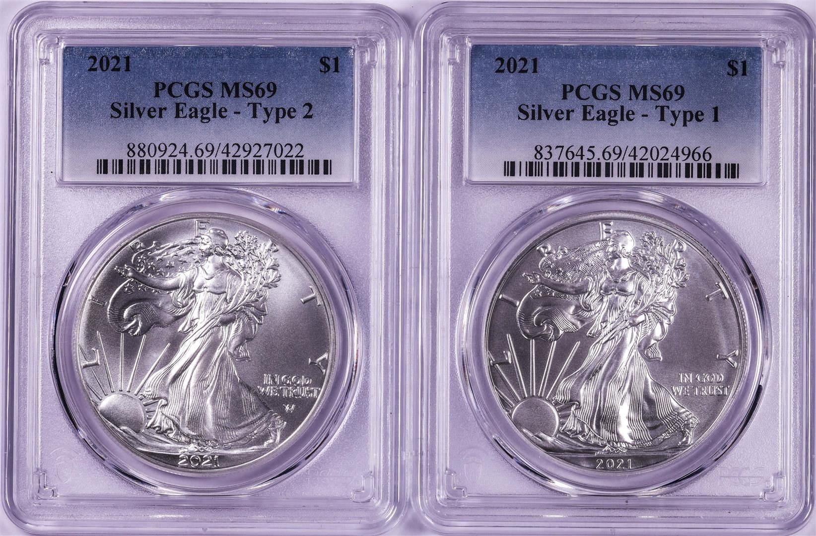 One Lot of 2021 Type 1 & 2 $1 American Silver Eagle Coins PCGS MS69.