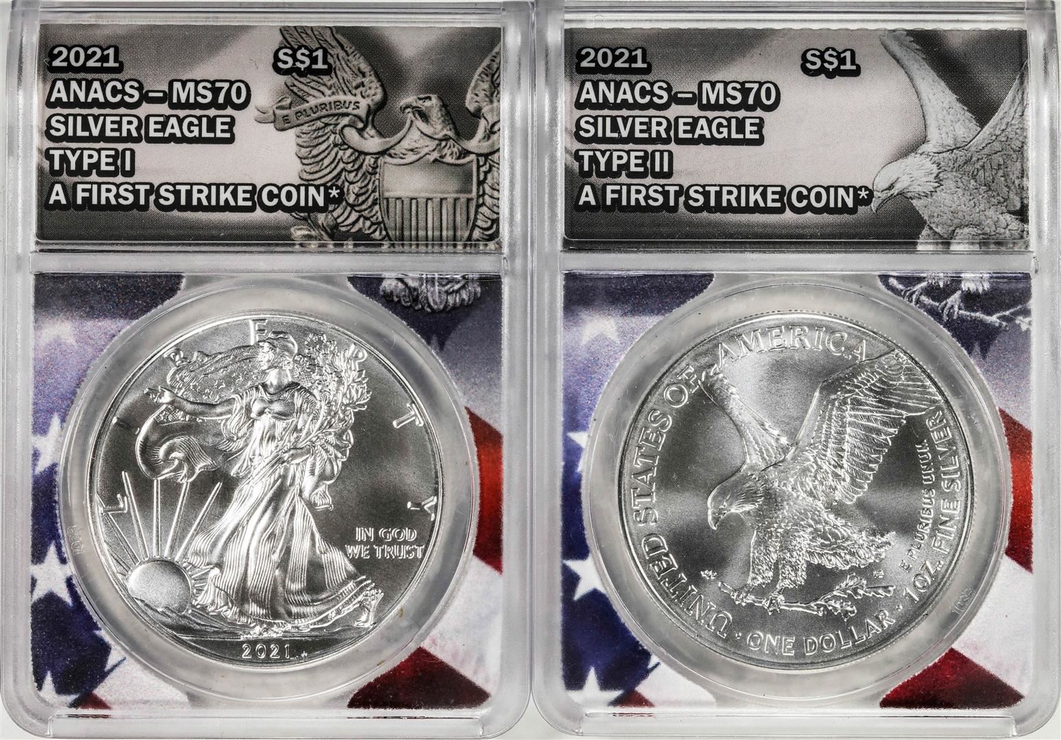 One Lot of 2021 Type 1 & Type 2 $1 American Silver Eagle Coins ANACS MS70 First Strike. ANACS Certified.