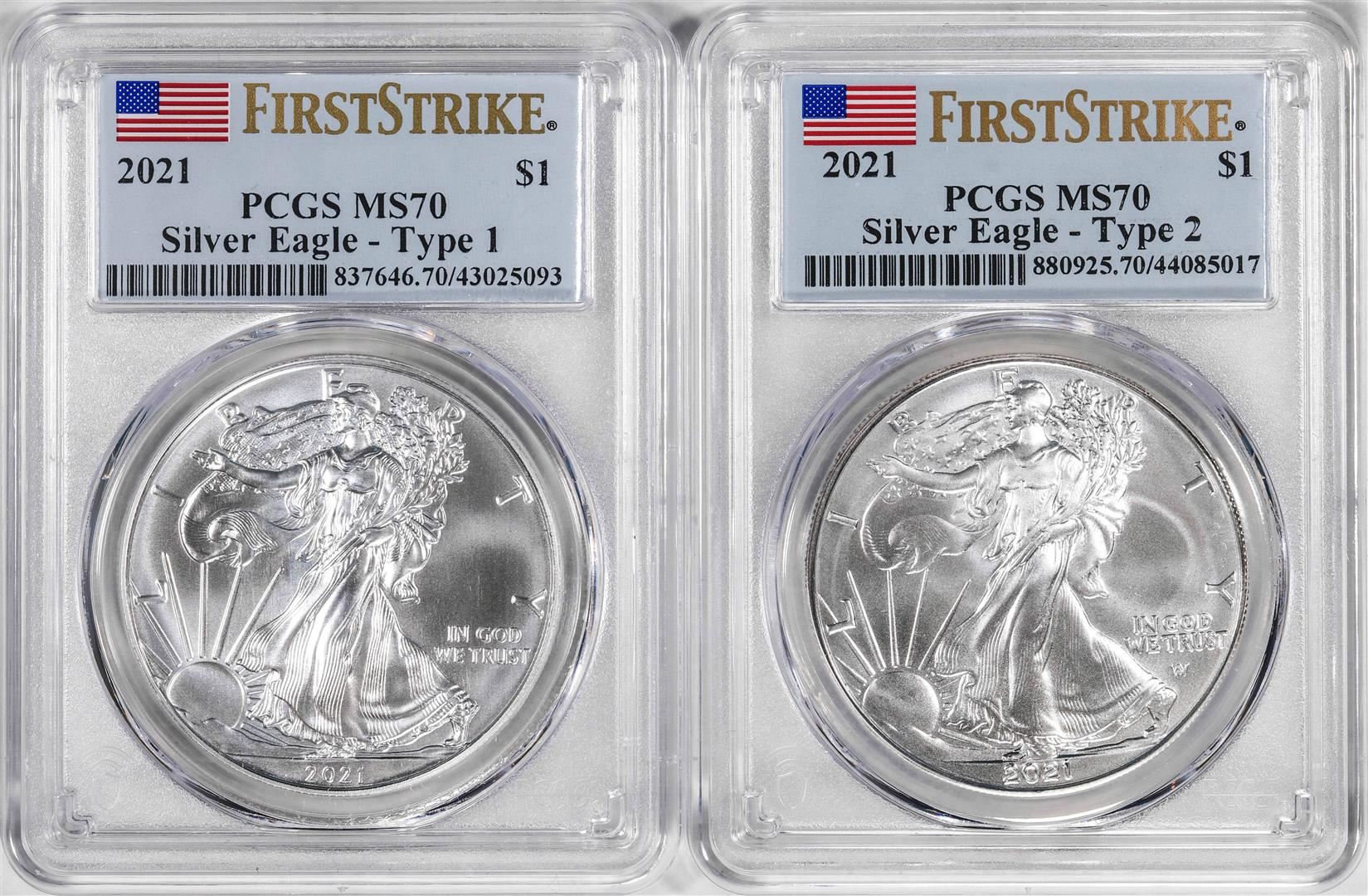 One Lot of 2021 Type 1 & Type 2 $1 American Silver Eagle Coins PCGS MS70 First Strike. PCGS Graded.