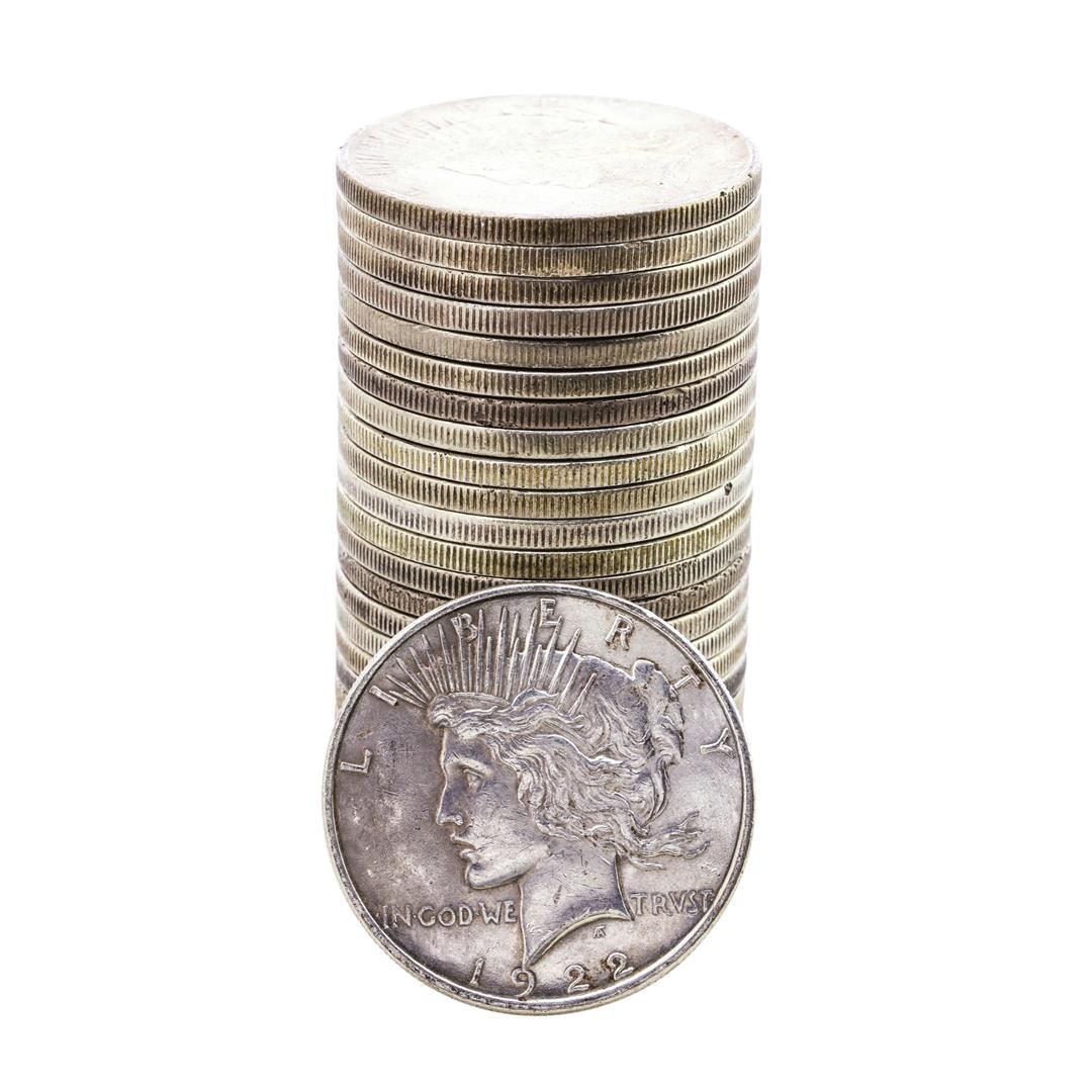 One Lot of (25) $1 Peace Silver Dollar Coins.