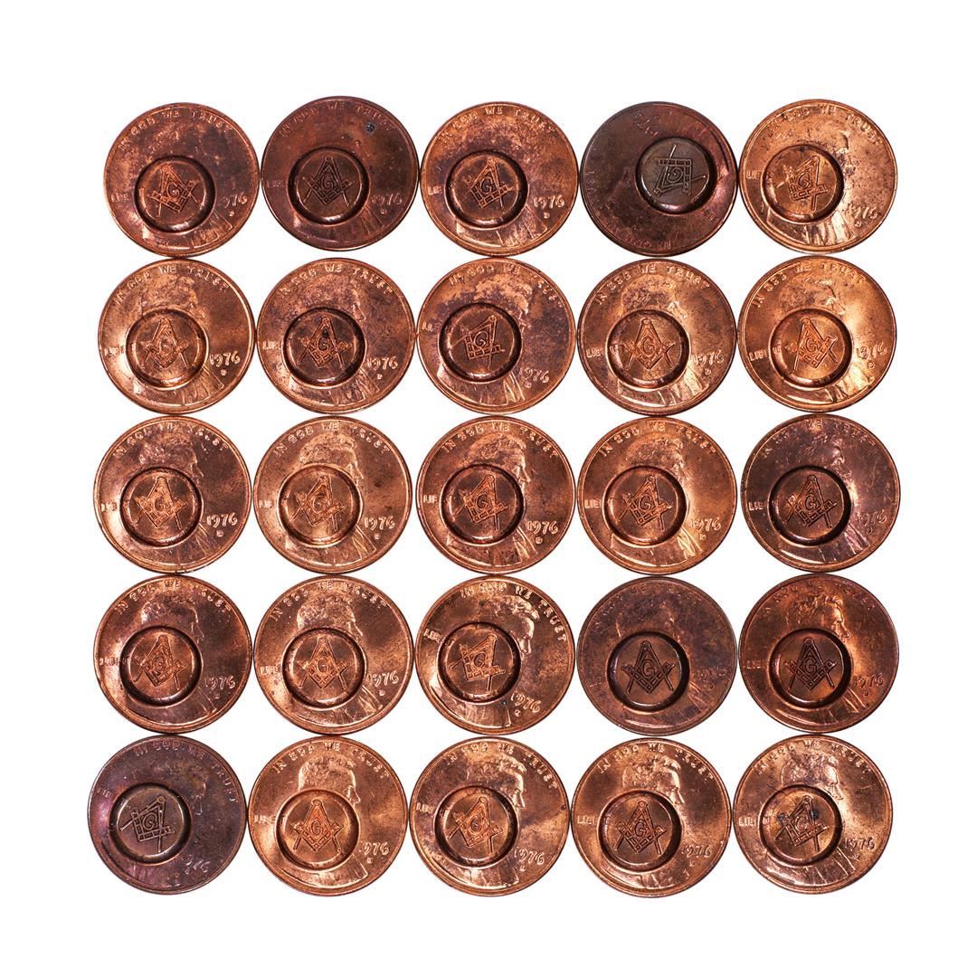 One Lot of (25) 1976-D Pushed Out Counter Stamped Masonic Lincoln Memorial Cent Coins.