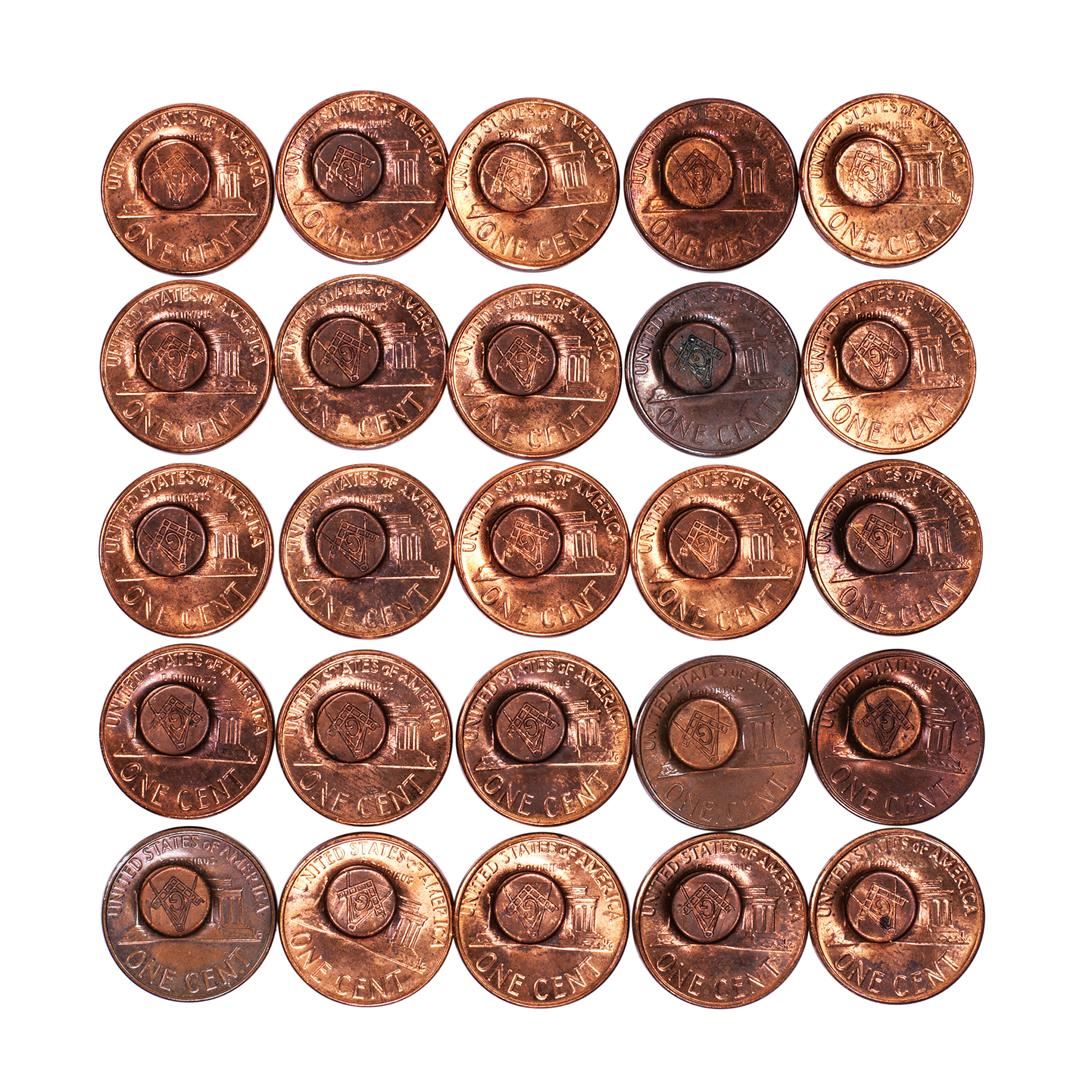 One Lot of (25) 1976-D Pushed Out Counter Stamped Masonic Lincoln Memorial Cent Coins.