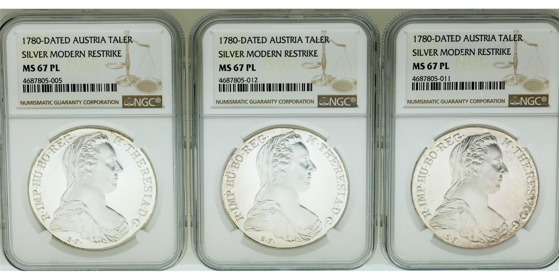 One Lot of (3) 1780 Austria Taler Restrike Silver Coins NGC MS67PL. NGC Certified.