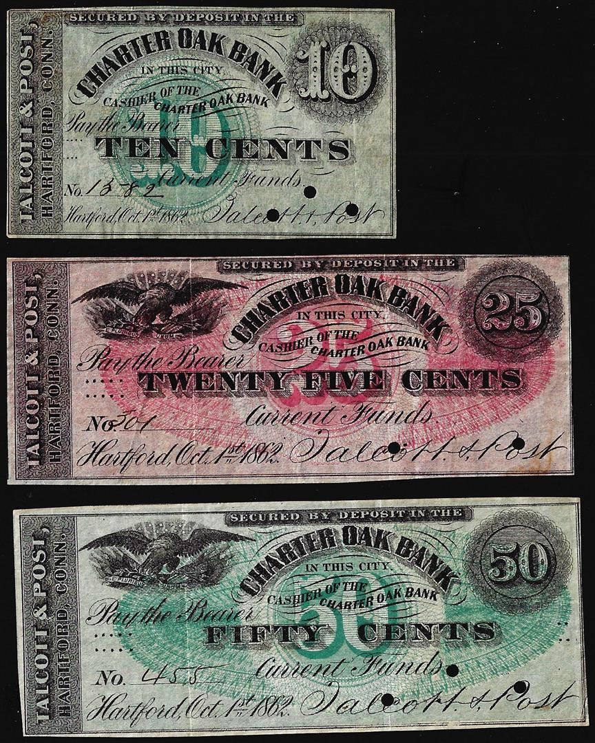 One Lot of (3) 1862 Charter Oak Bank Fractional Obsolete Notes.