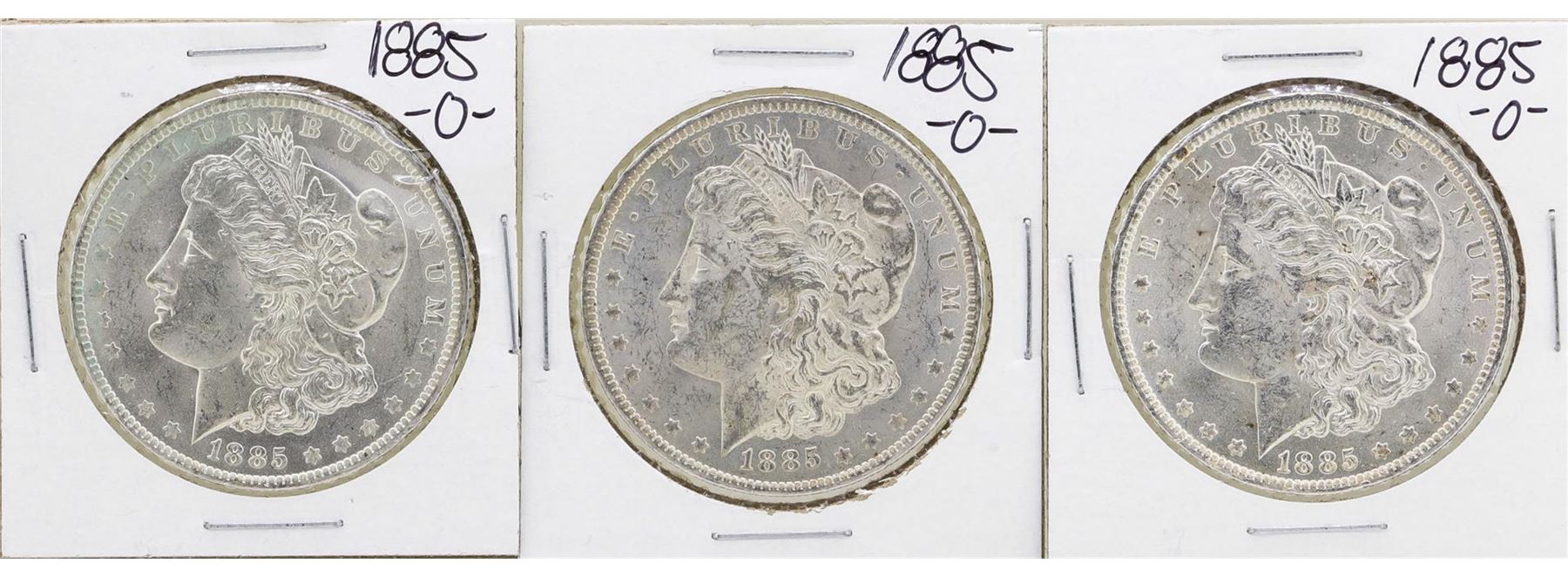 One Lot of (3) 1885-O $1 Morgan Silver Dollar Coins.