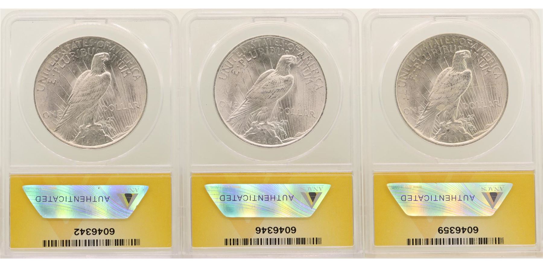 One Lot of (3) 1923 $1 Peace Silver Dollar Coins ANACS MS64. ANACS Certified.