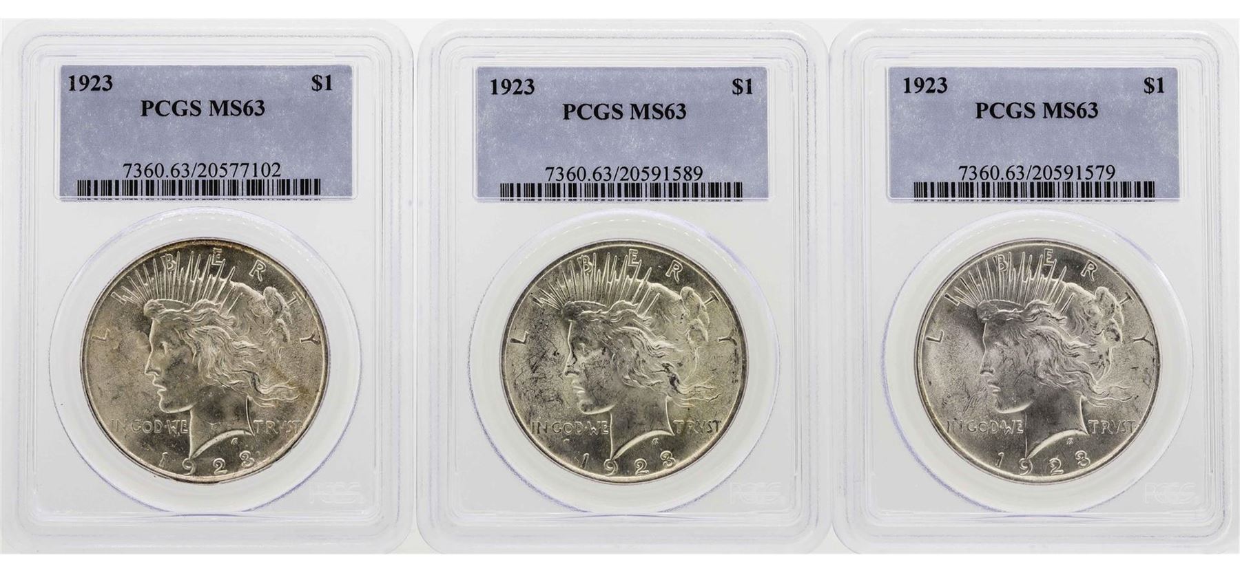 One Lot of (3) 1923 $1 Peace Silver Dollar Coins PCGS MS63. PCGS Graded.