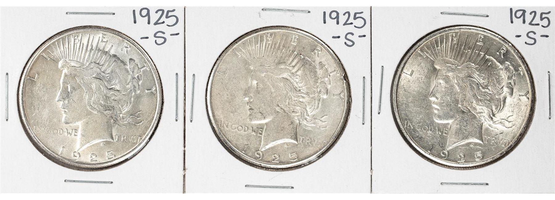 One Lot of (3) 1925-S $1 Peace Silver Dollar Coins.