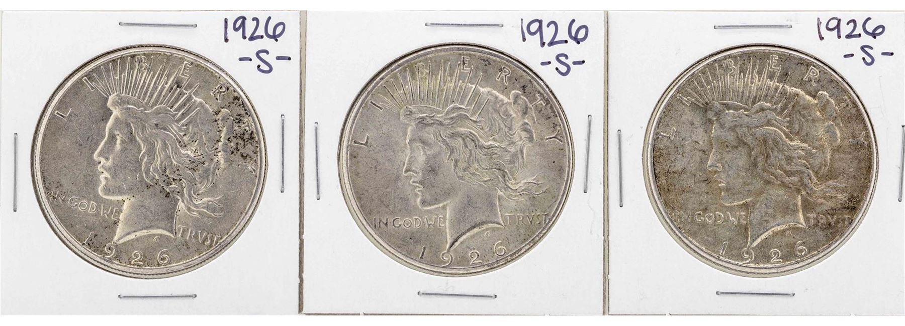 One Lot of (3) 1926-S $1 Peace Silver Dollar Coins.