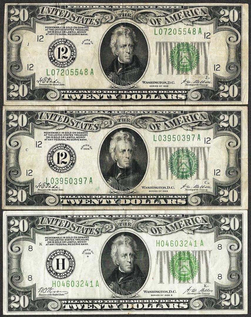 Lot of (3) 1928 $20 Federal Reserve Notes - Redeemable in Gold