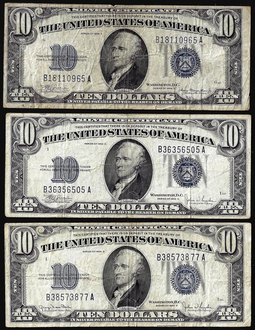 One Lot of (3) 1934 $10 Silver Certificate Notes.