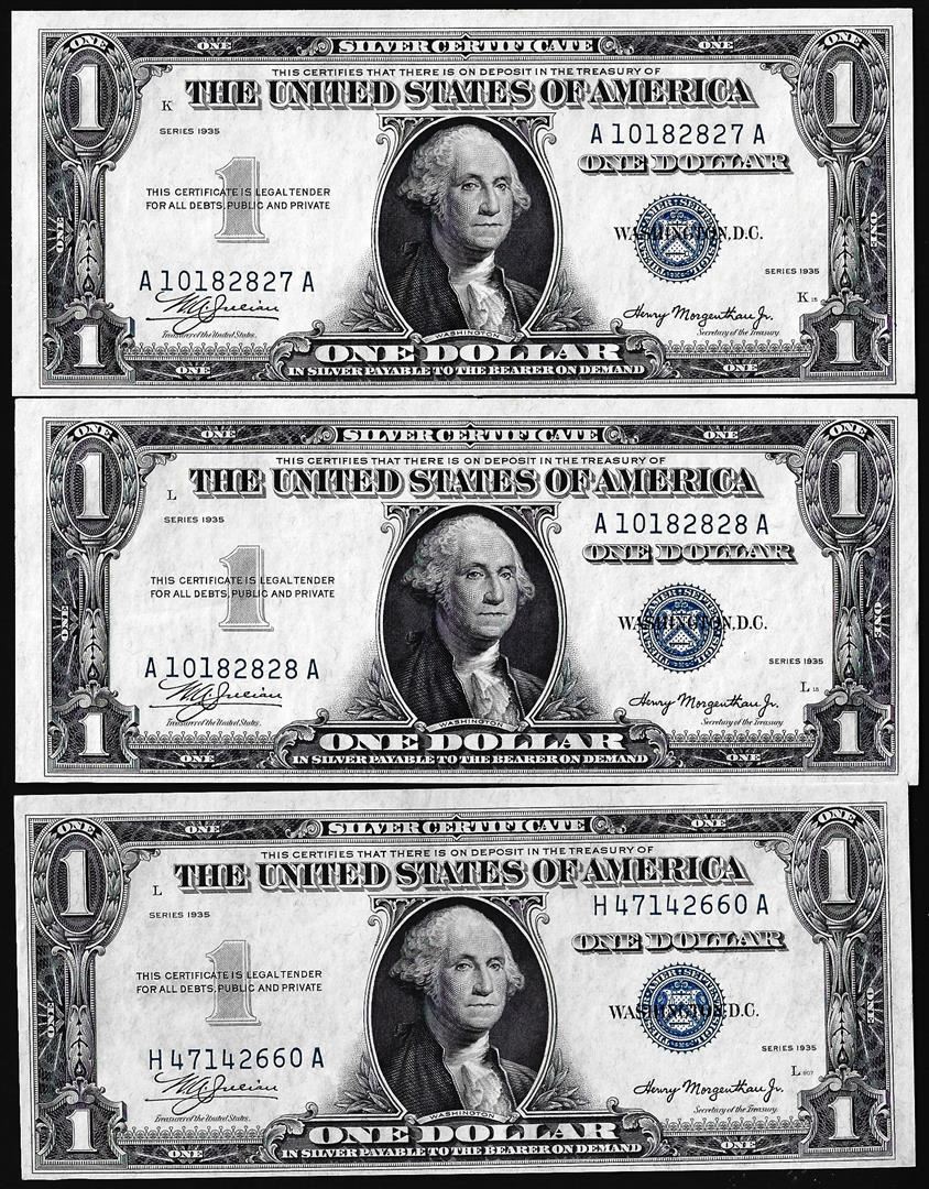 One Lot of (3) 1935 $1 Silver Certificate Notes.