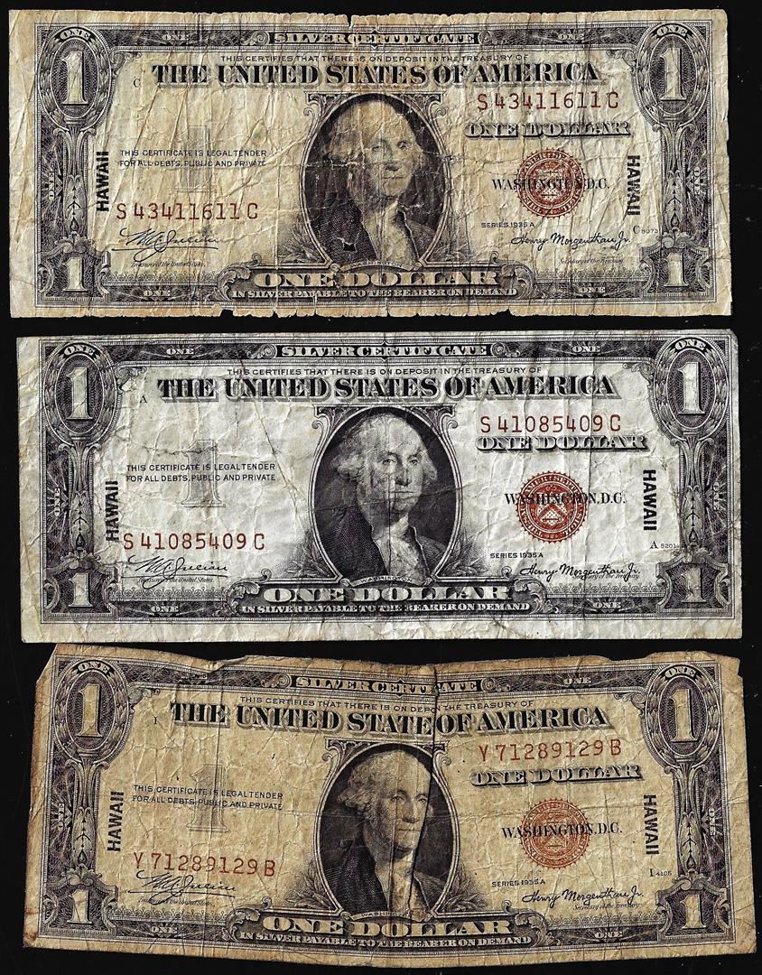 Lot of (3) 1935A $1 Hawaii WWII Emergency Issue Silver Certificate Notes