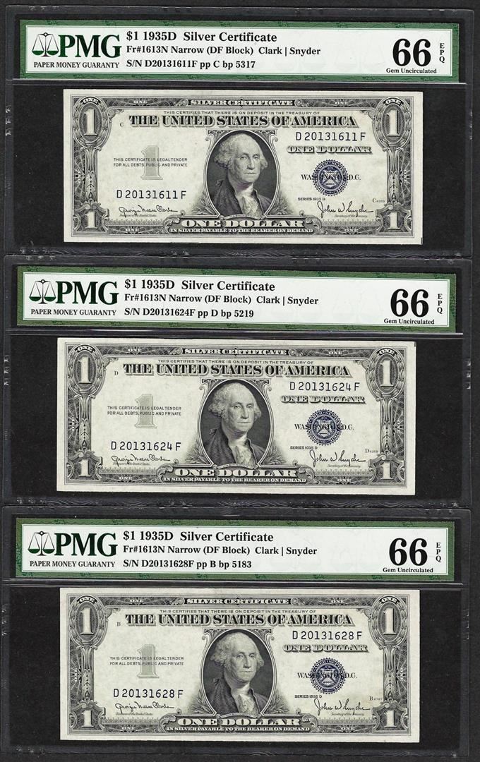 One Lot of (3) 1935D $1 Silver Certificate Notes Fr.1613N PMG Gem Uncirculated 66EPQ. PMG Certified.