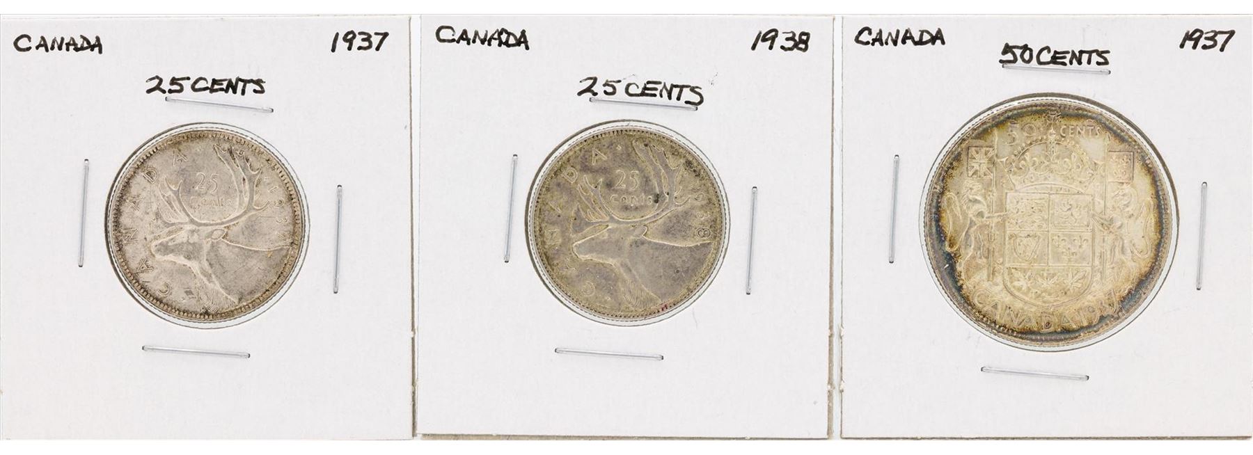 One Lot of (3) 1937-1938 Canada 25 Cent Coins.