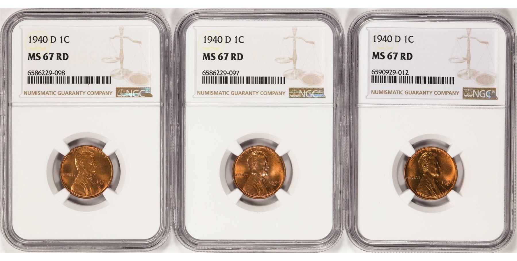One Lot of (3) 1940-D Lincoln Wheat Cent Coins NGC MS67RD. NGC Certified.