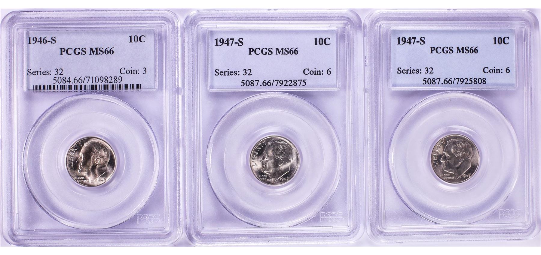 One Lot of (3) 1946-S & 1947-S Roosevelt Dime Coins PCGS MS66. PCGS Graded.