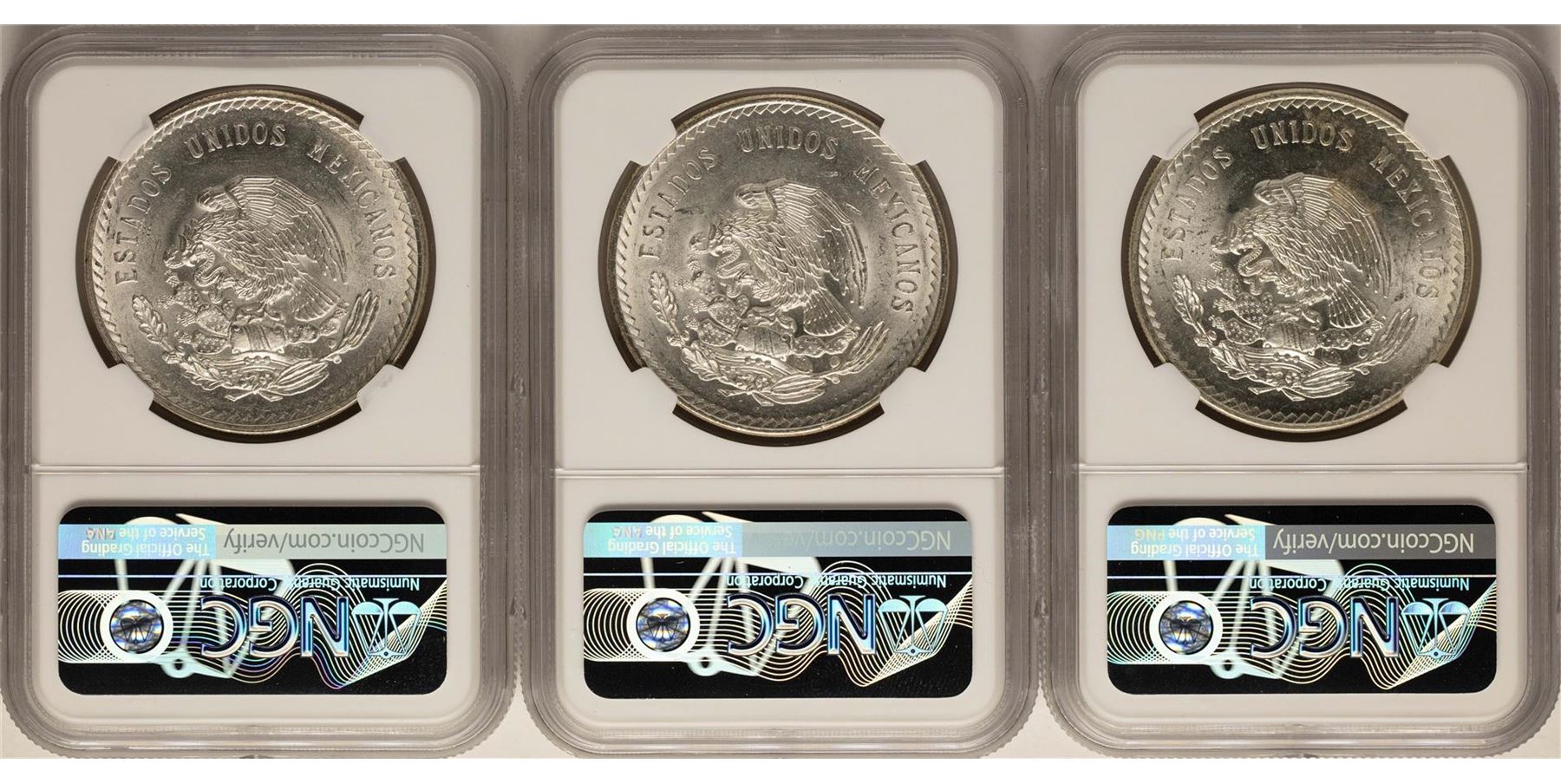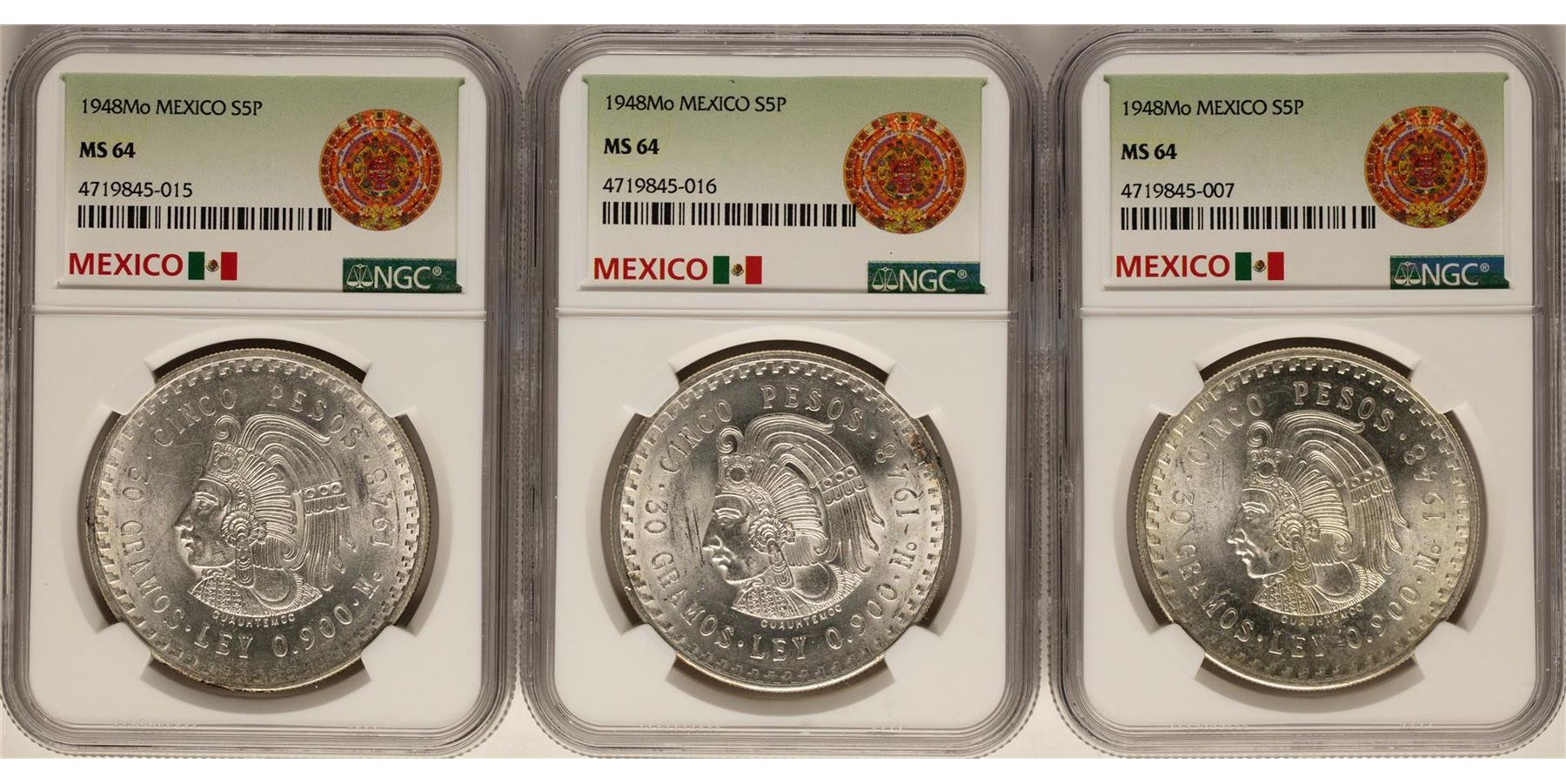 One Lot of (3) 1948Mo Mexico 5 Pesos Silver Coins NGC MS64. NGC Certified.