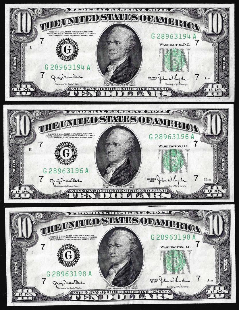 One Lot of (3) 1950 $10 Federal Reserve Notes Chicago.