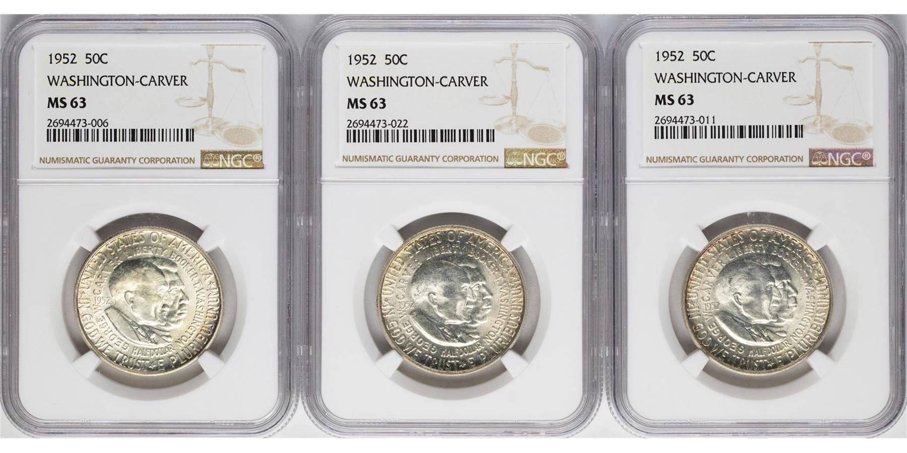 One Lot of (3) 1952 Washington-Carver Commemorative Half Dollar Coins NGC MS63. NGC Certified.