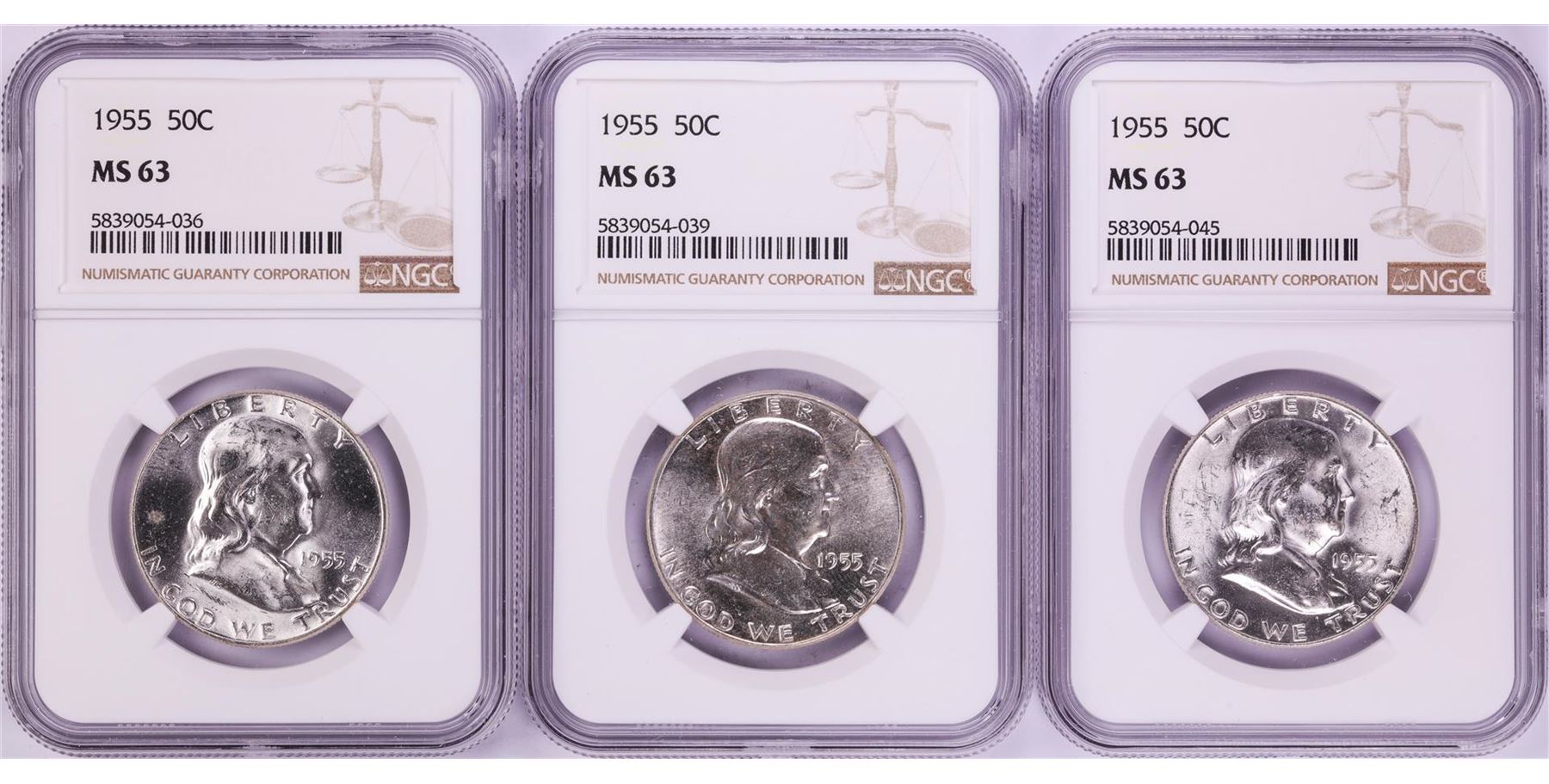 One Lot of (3) 1955 Franklin Half Dollar Coins NGC MS63. NGC Certified.