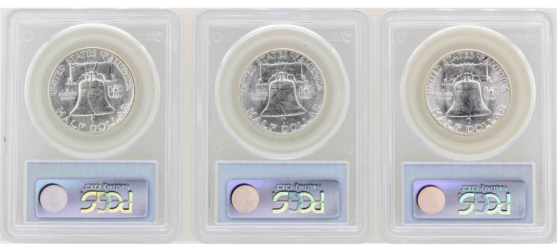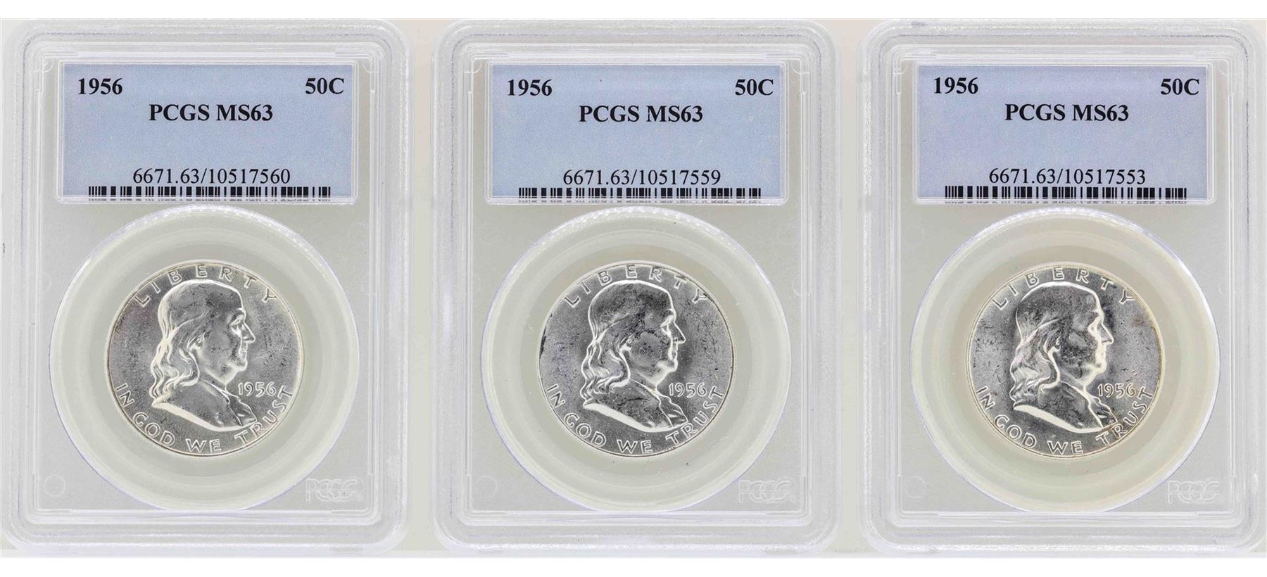 One Lot of (3) 1956 Franklin Half Dollar Coins NGC MS63. NGC Certified.