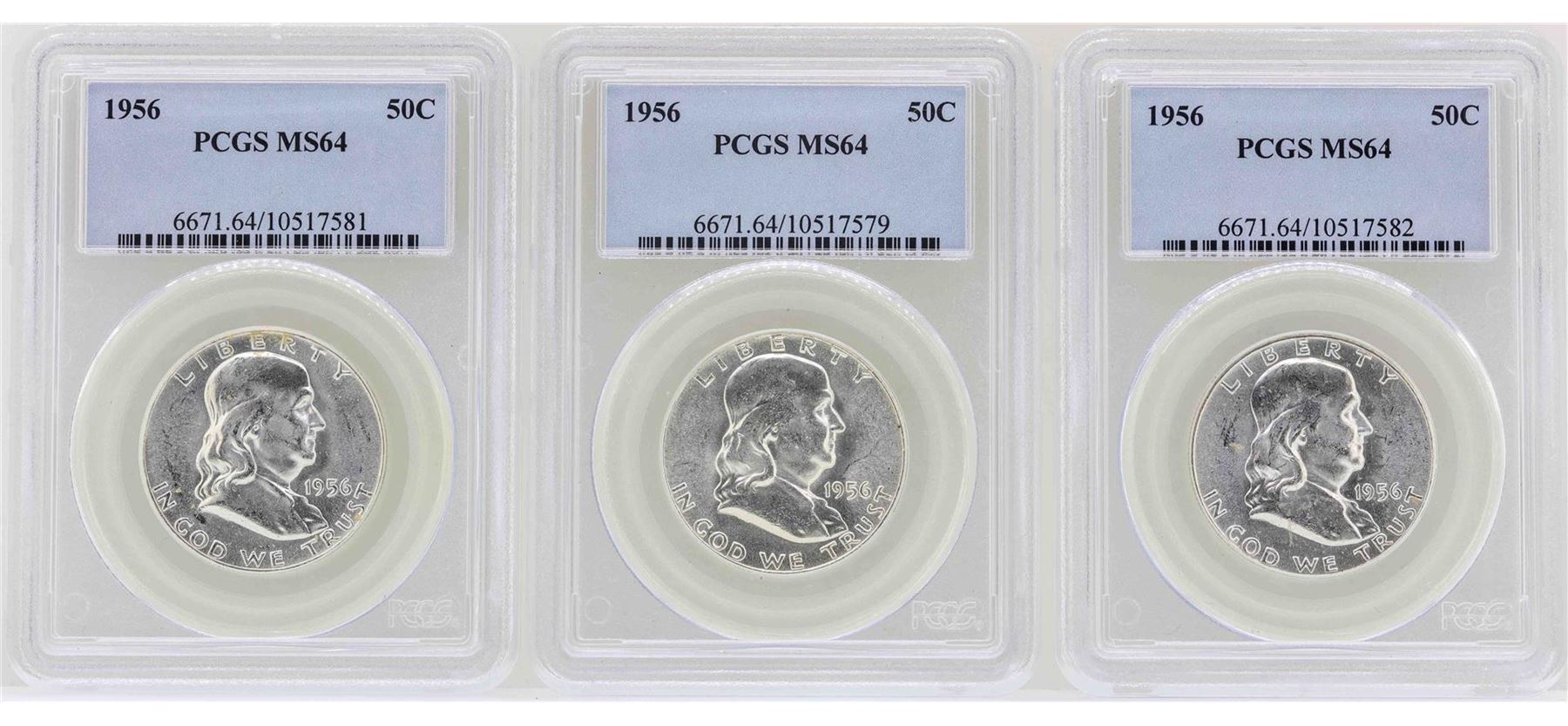 One Lot of (3) 1956 Franklin Half Dollar Coins NGC MS64. NGC Certified.