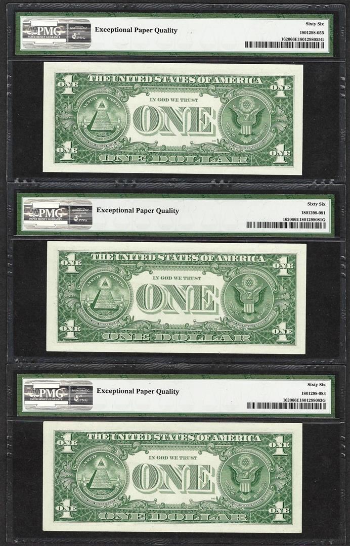 One Lot of (3) 1957A $1 Silver Certificate Notes Fr.1620 PMG Gem Uncirculated 66EPQ. PMG Certified.