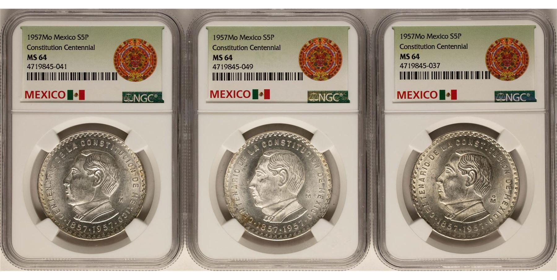 One Lot of (3) 1957Mo Mexico 5 Pesos Constitution Centennial Silver Coins NGC MS64. NGC Certified.