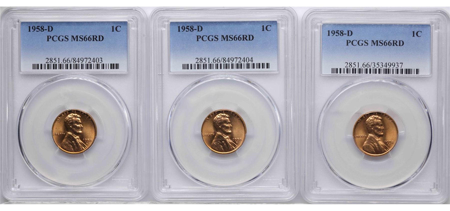 One Lot of (3) 1958-D Lincoln Wheat Cent Coins PCGS MS66RD. PCGS Graded.