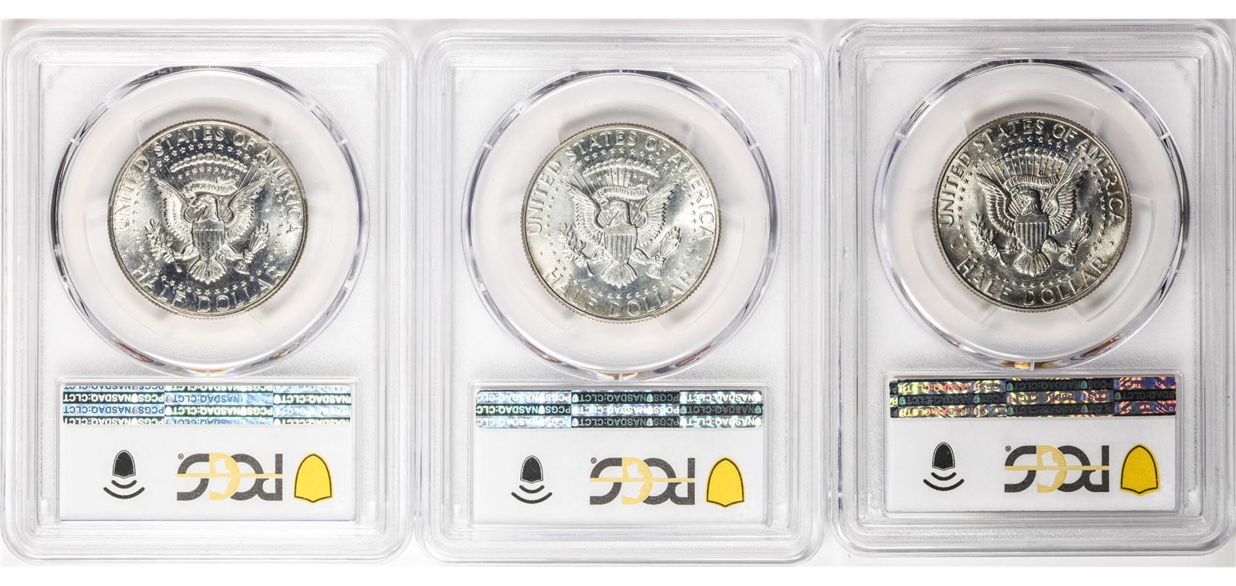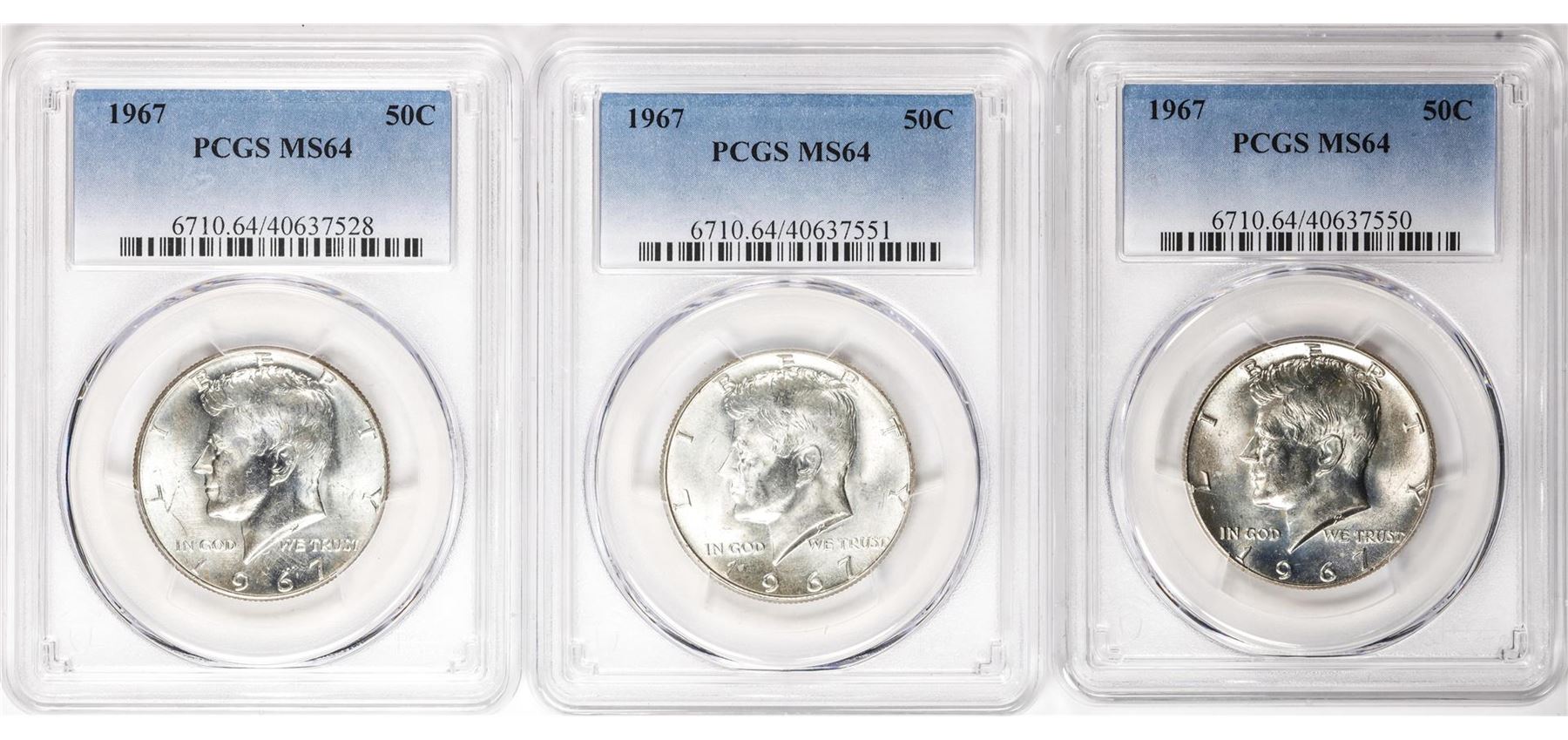 One Lot of (3) 1967 Kennedy Half Dollar Coins PCGS MS64. PCGS Graded.