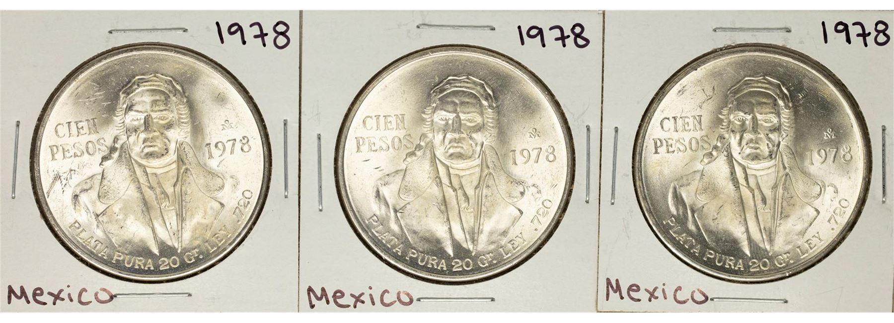 One Lot of (3) 1978 Mexico Cien Pesos Silver Coins.