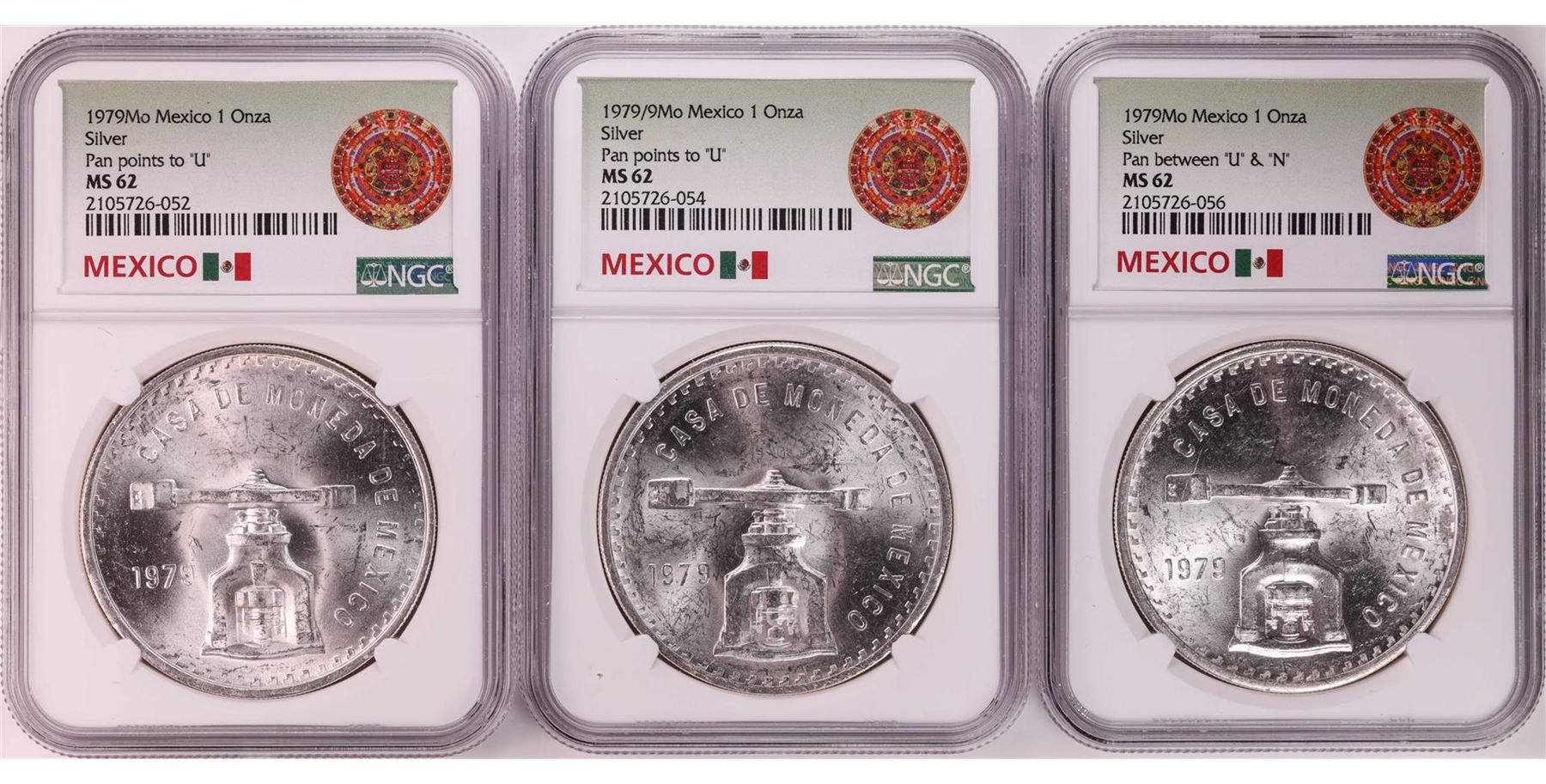 One Lot of (3) 1979Mo Mexico 1 Onza Silver Coins NGC MS62. NGC Certified.