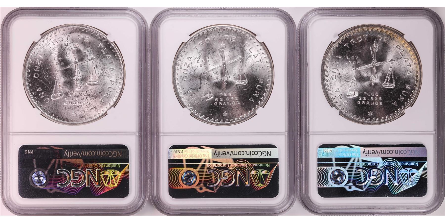 One Lot of (3) 1979Mo Mexico 1 Onza Silver Coins NGC MS62. NGC Certified.