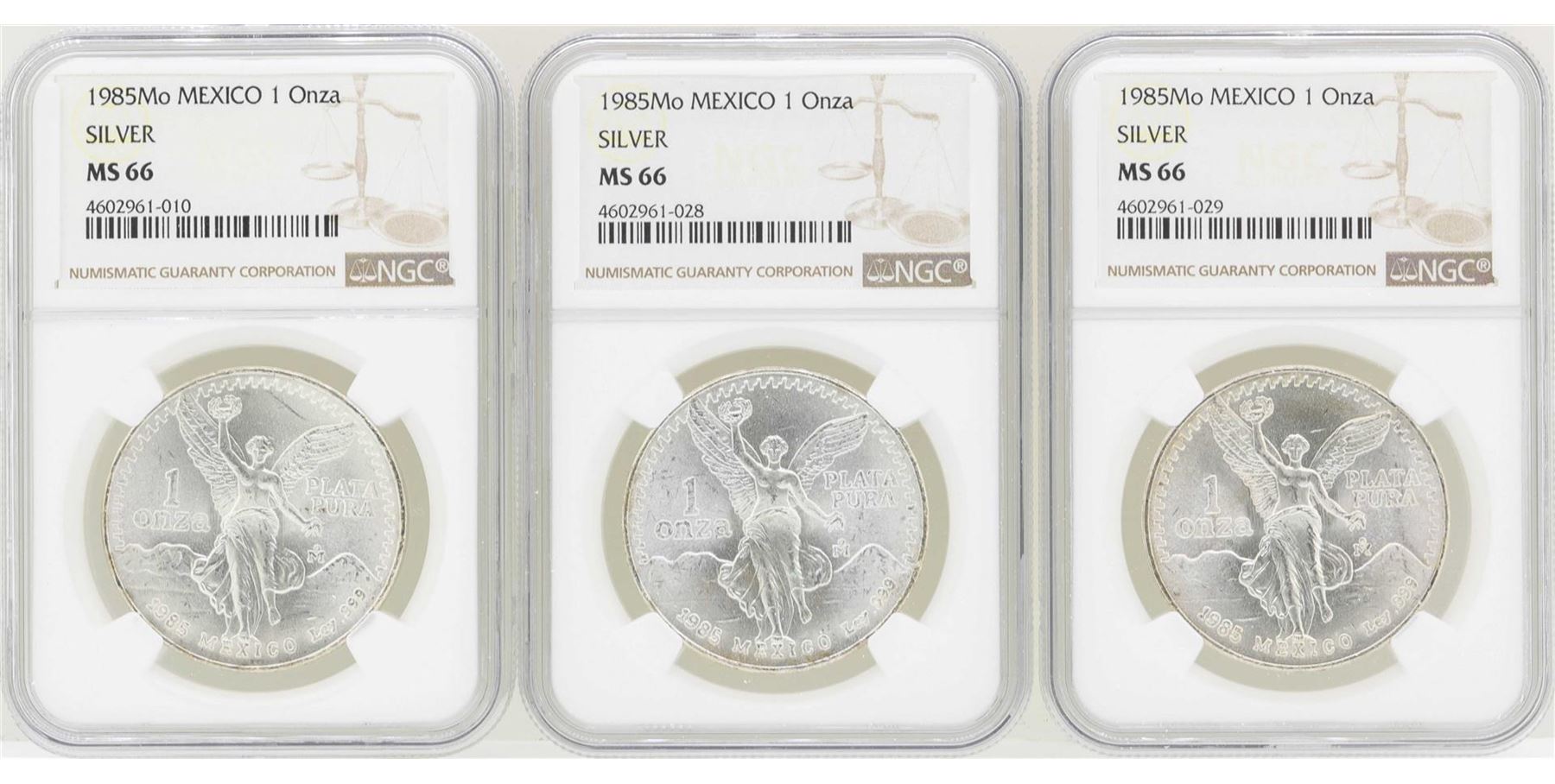 One Lot of (3) 1985Mo 1 Onza Silver Libertad Coins NGC MS66. NGC Certified.