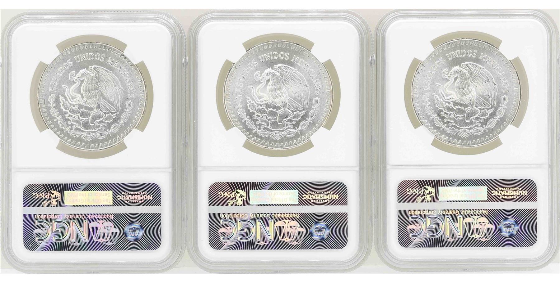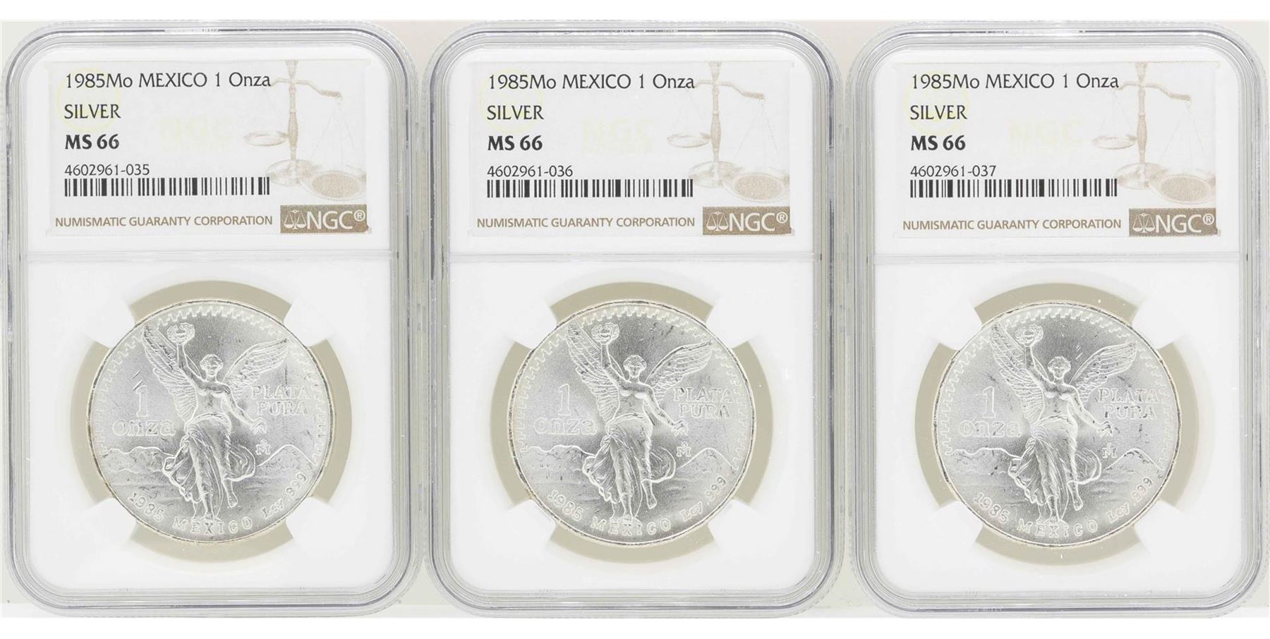 One Lot of (3) 1985Mo 1 Onza Silver Libertad Coins NGC MS66. NGC Certified.