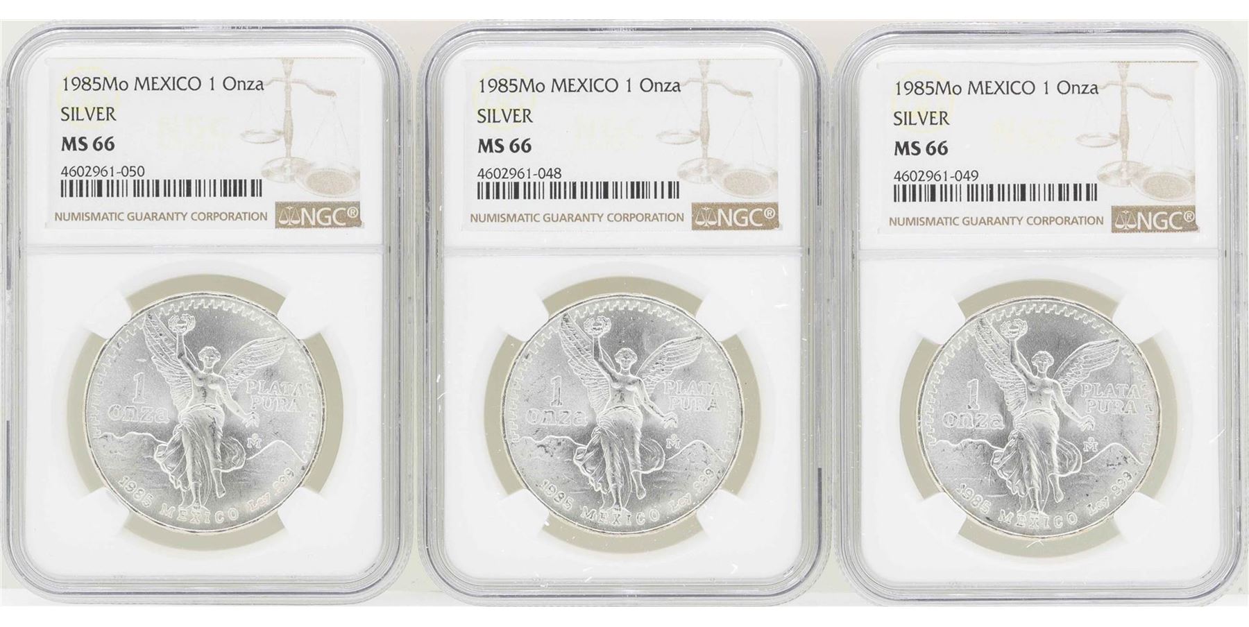 One Lot of (3) 1985Mo 1 Onza Silver Libertad Coins NGC MS66. NGC Certified.