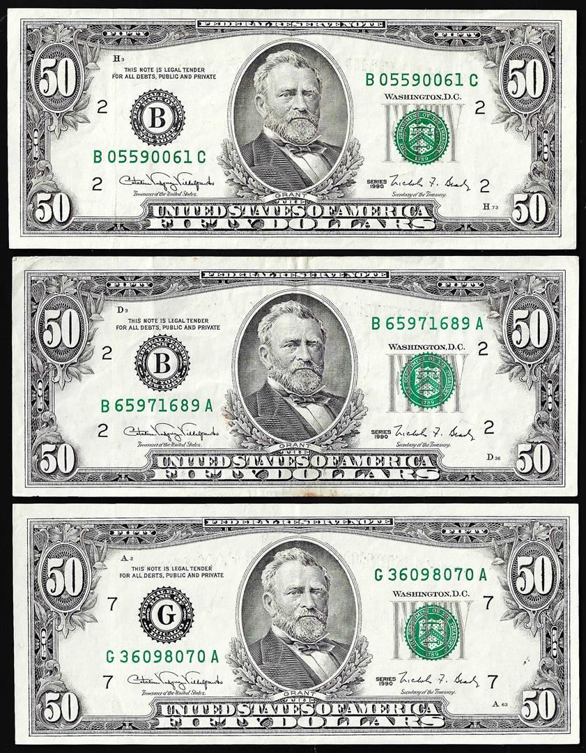One Lot of (3) 1990 $50 Federal Reserve Notes Minor Offset Error.