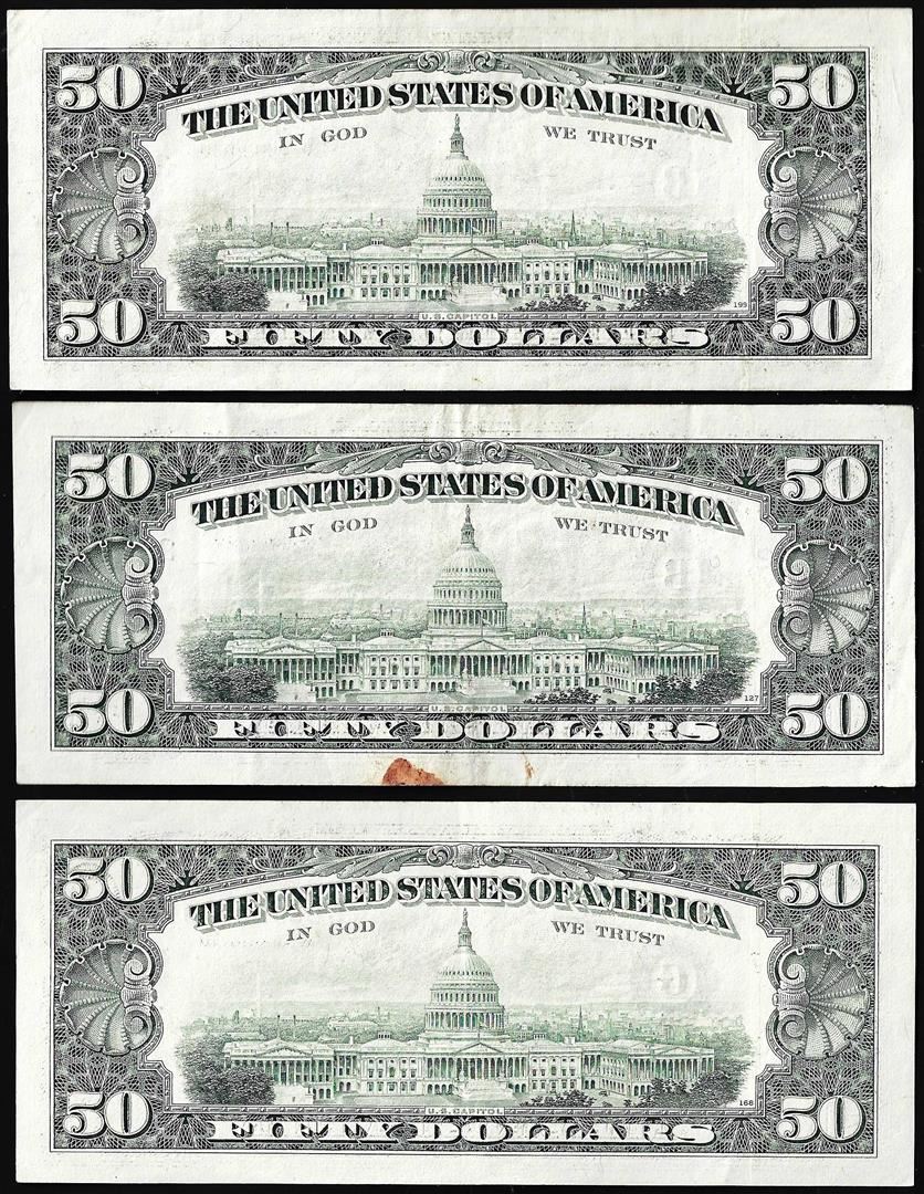 Lot of (3) 1990 $50 Federal Reserve Notes Minor Offset Error