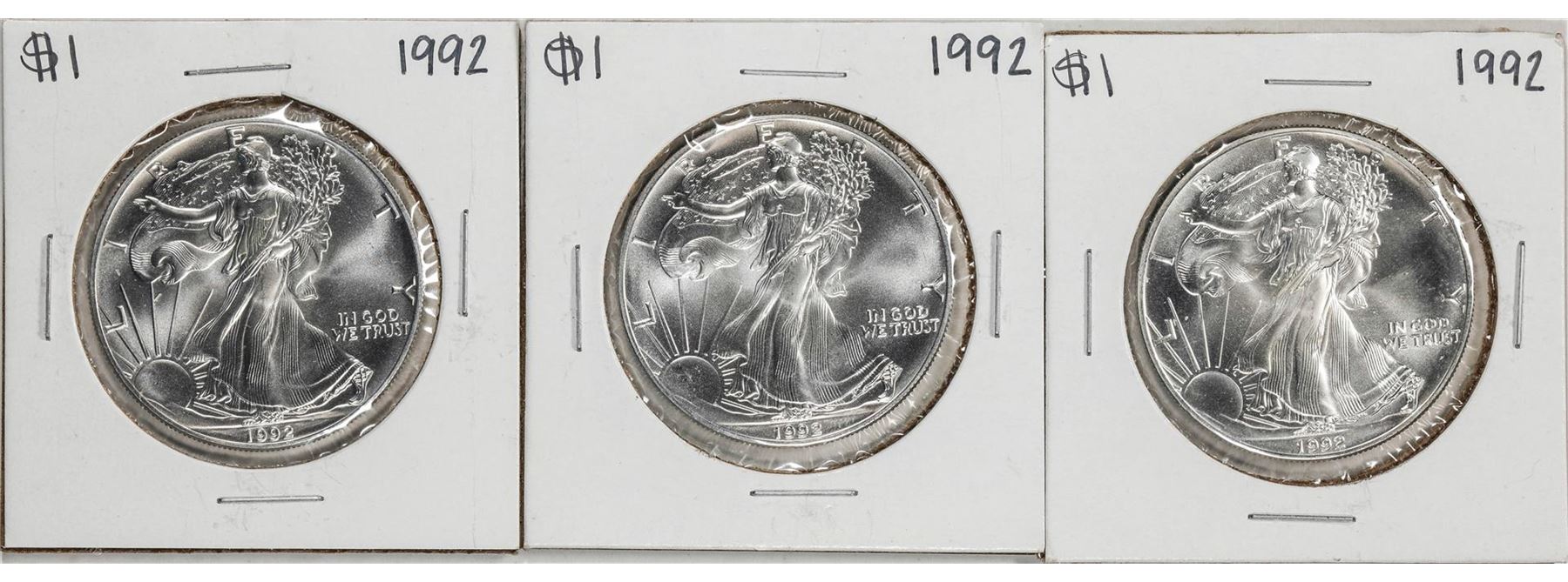 One Lot of (3) 1992 $1 American Silver Eagle Coins.