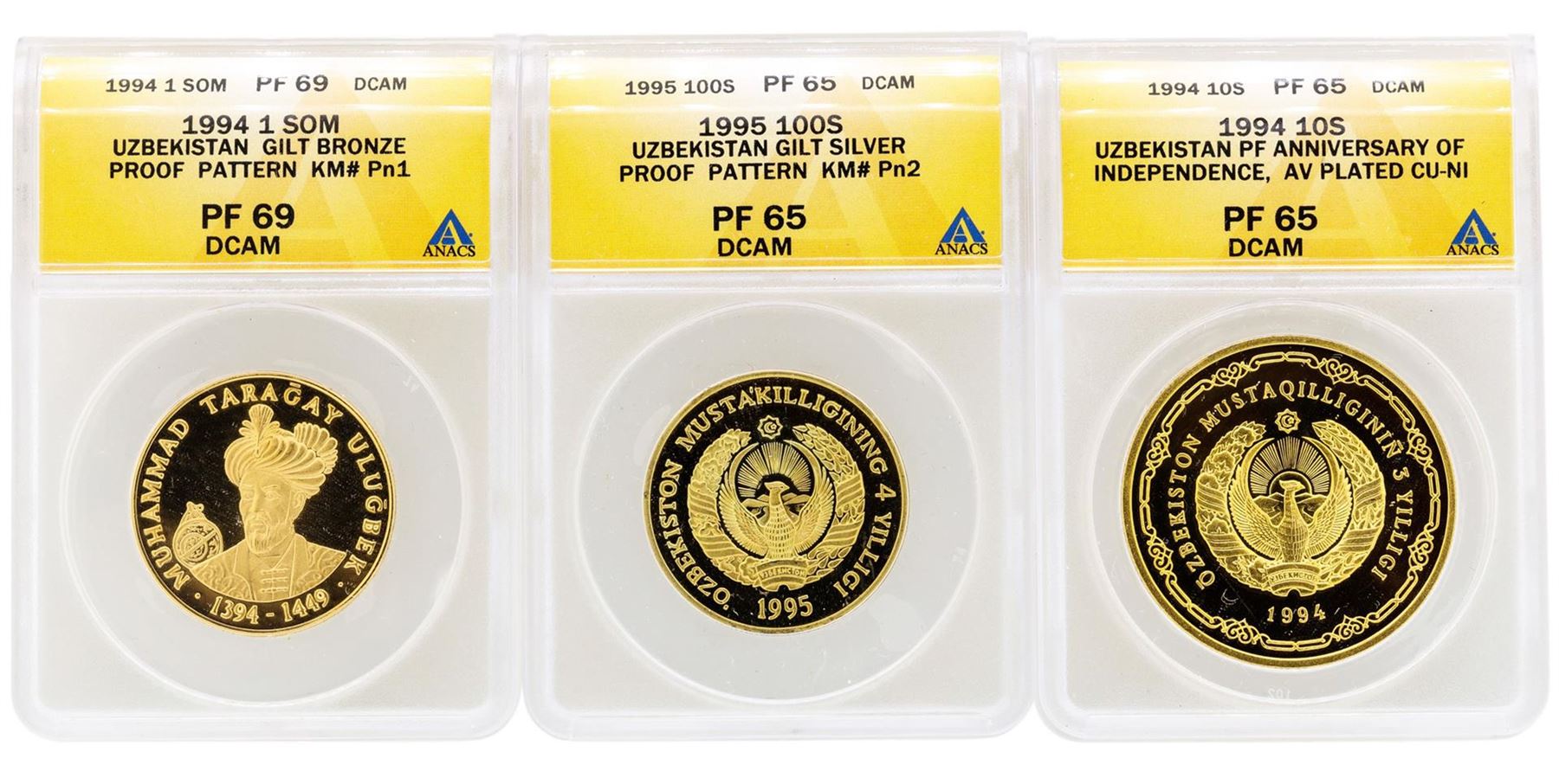 One Lot of (3) 1994-1995 Uzbekistan Proof Coins ANACS PF65/PR69. ANACS Certified.