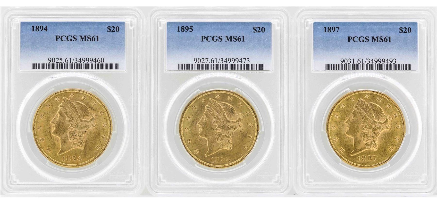 One Lot of (3) $20 Liberty Head Double Eagle Gold Coins PCGS MS61. PCGS Graded.