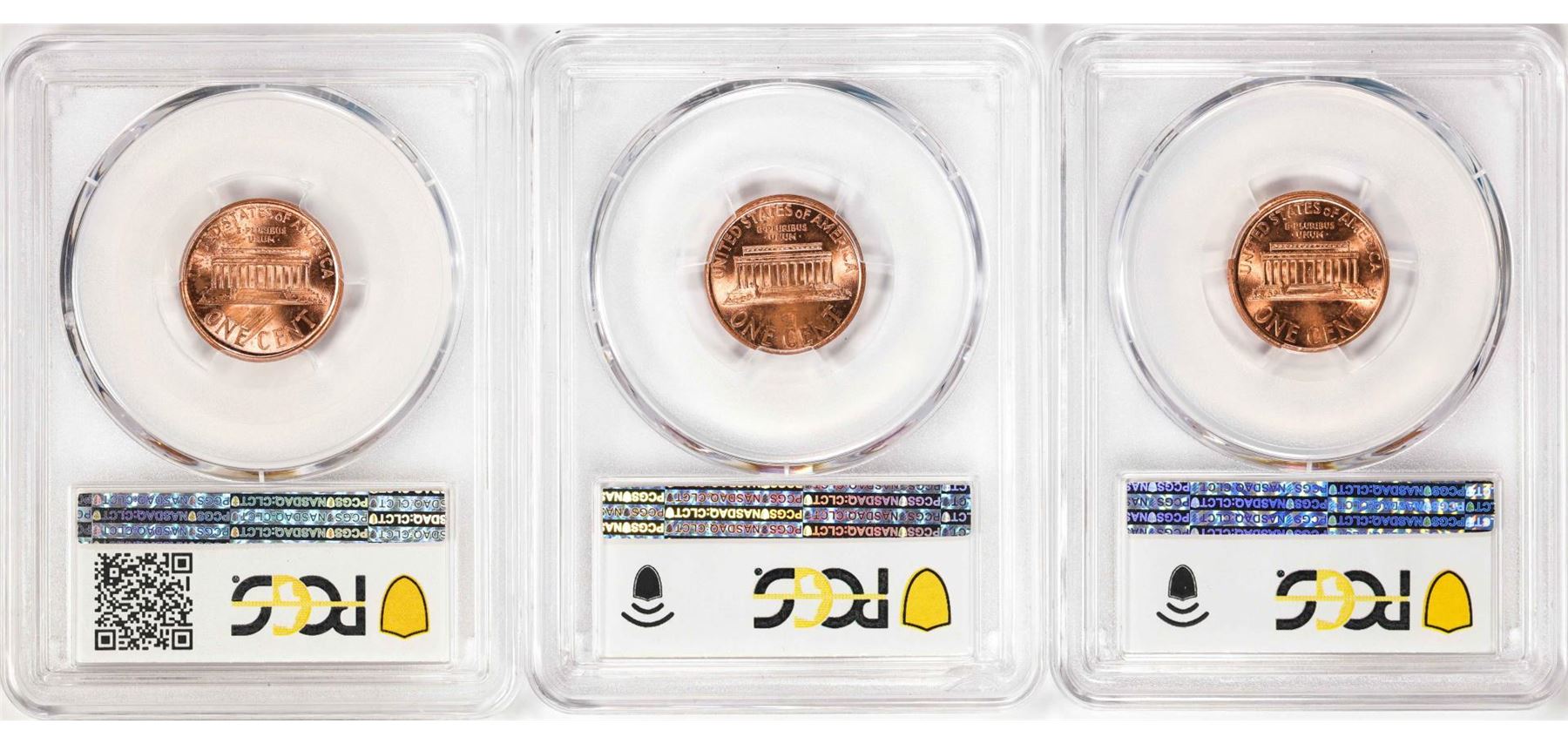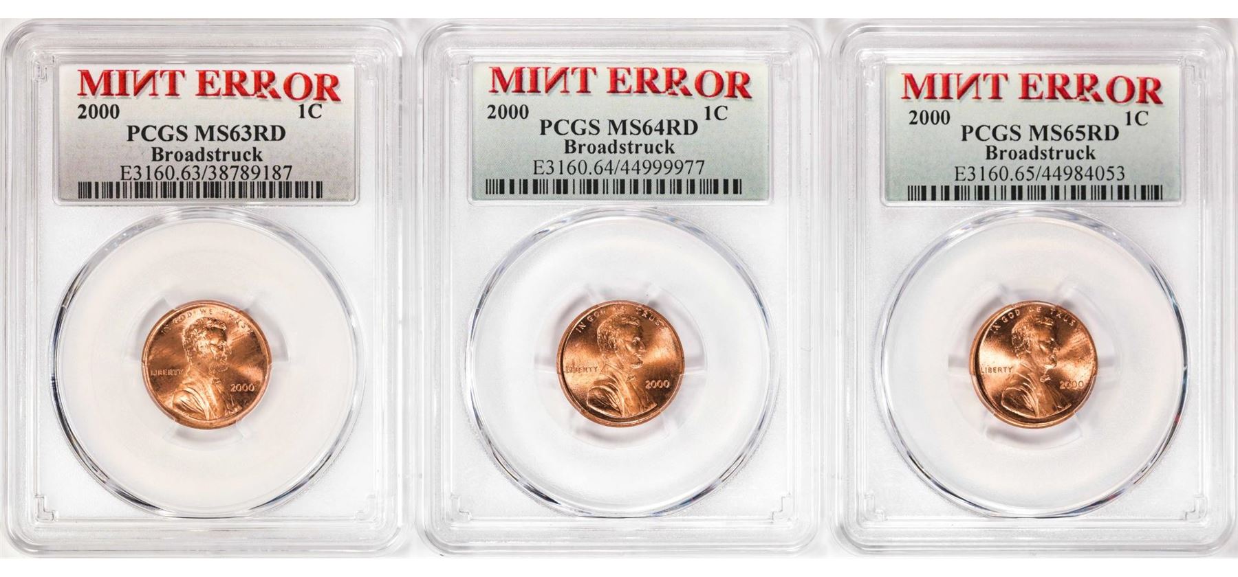 One Lot of (3) 2000 Lincoln Memorial Cent Coins Mint Error Broadstruck PCGS MS63/64/65RD. PCGS Graded.